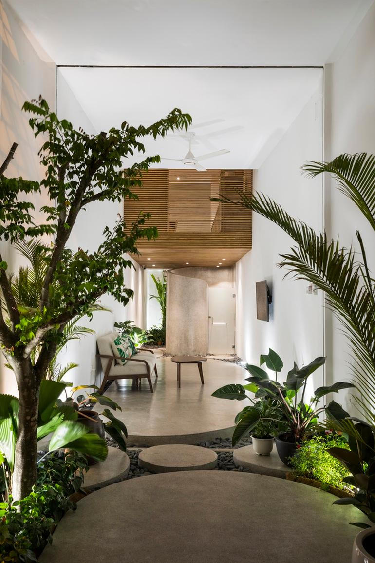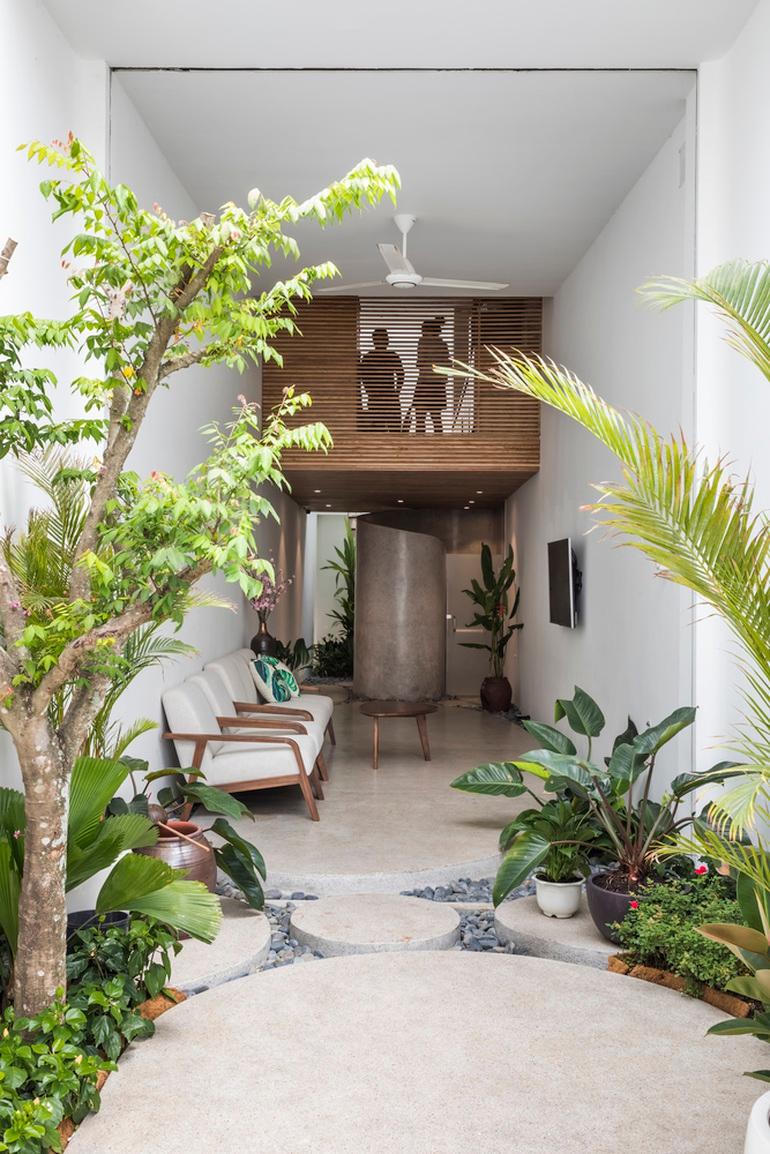 Dù có bề ngang chỉ 3 m, căn nhà có nhiều khoảng không cho cây xanh phát triển với 4 vườn cây mini trong nhà, giúp không khí luôn trong lành.