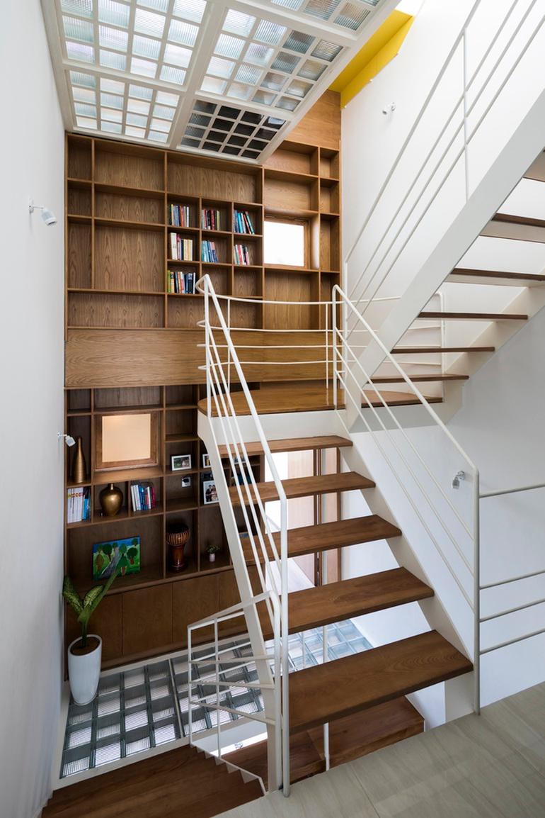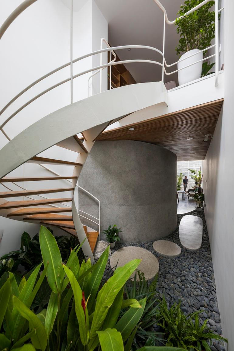 Giếng trời ở giữa chiếu thẳng xuống phần cầu thang nối đi các tầng và phân tách ngôi nhà thành hai không gian riêng biệt. Thiết kế thông tầng này giúp ngôi nhà có thể lưu thông khí ở tất cả không gian tại tầng 2 và 3.