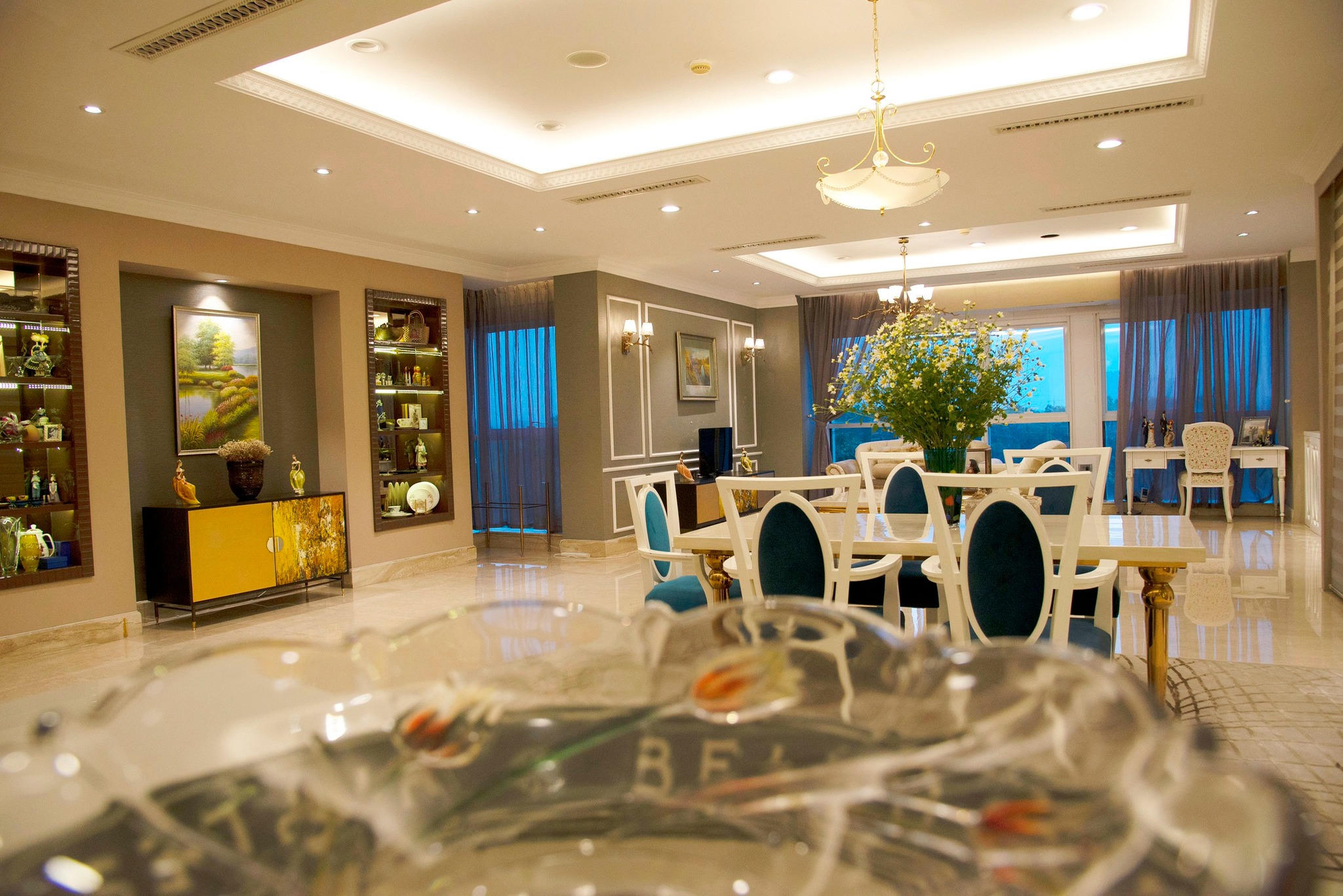 Bên trong phòng khách rộng 80 m2 được kết nối hài hòa giữa chức năng phòng khách, phòng ăn và sảnh trang trí, với tổng thể tông màu ấm.