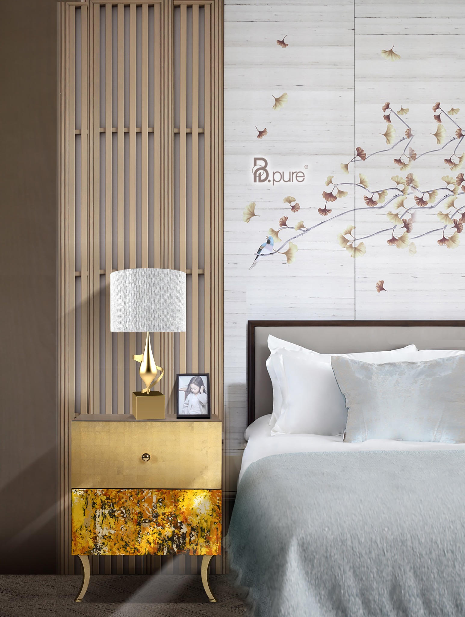 Tab đầu giườn.g trong khu vực phòng ngủ cũng được trang trí kèm theo một bức tranh sơn mài được trạm khắc bằng tay.