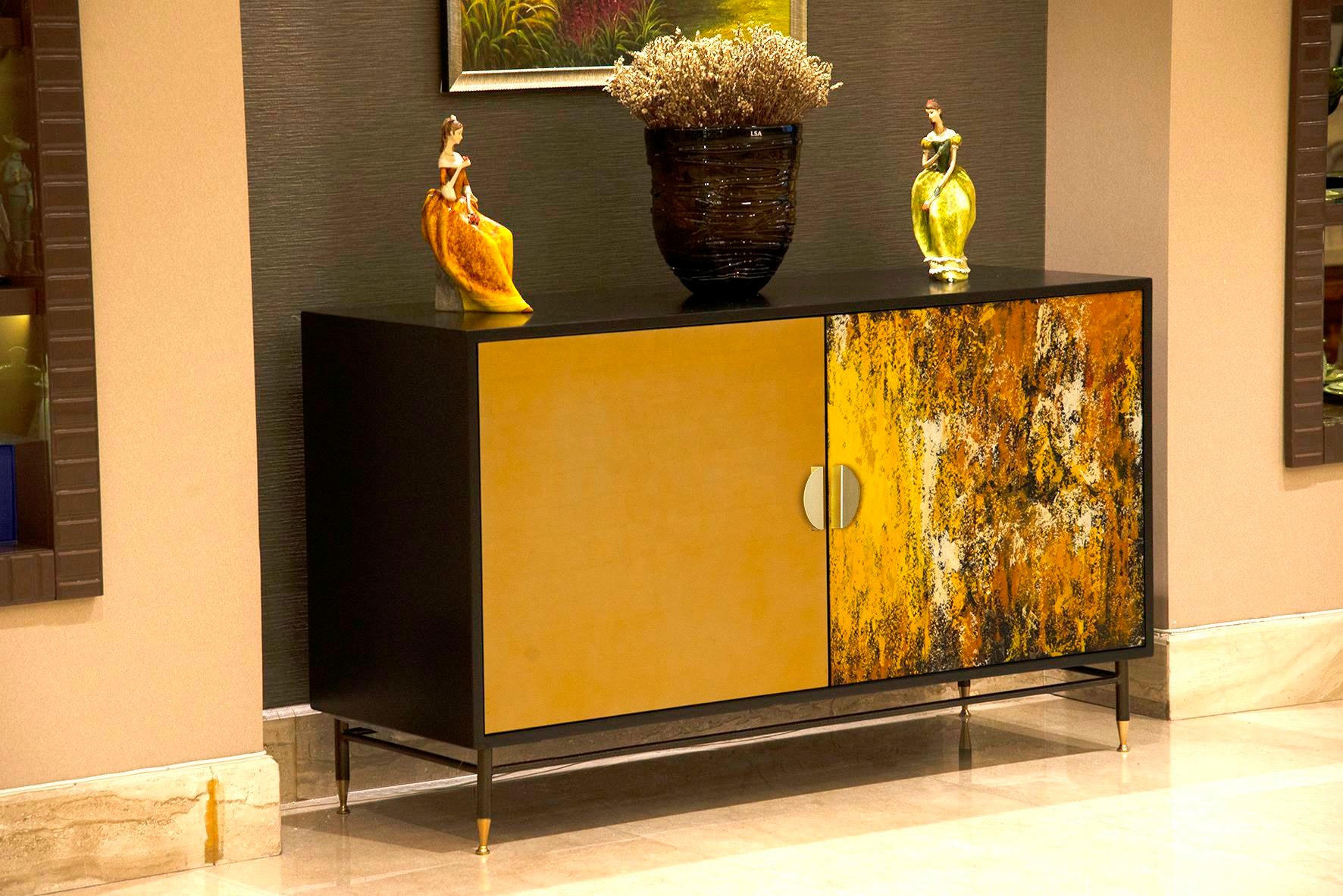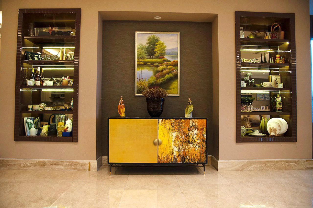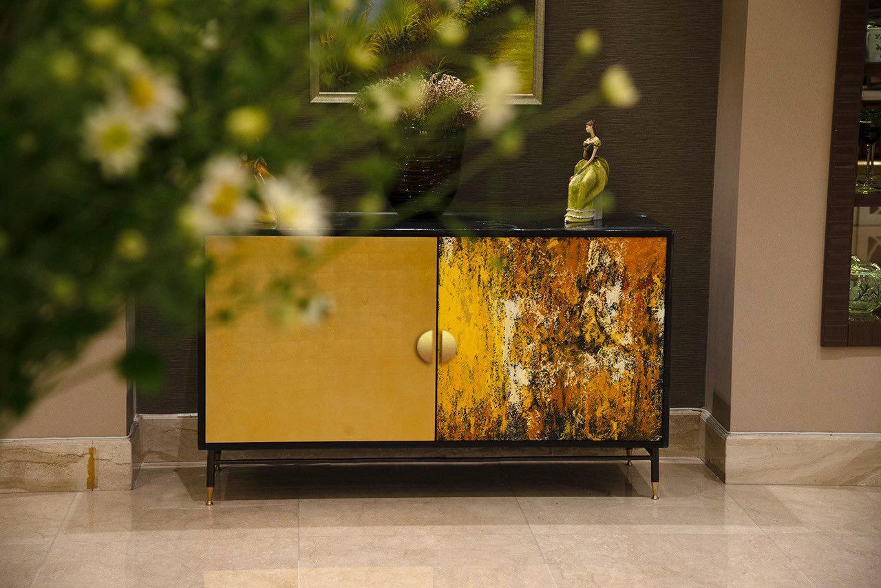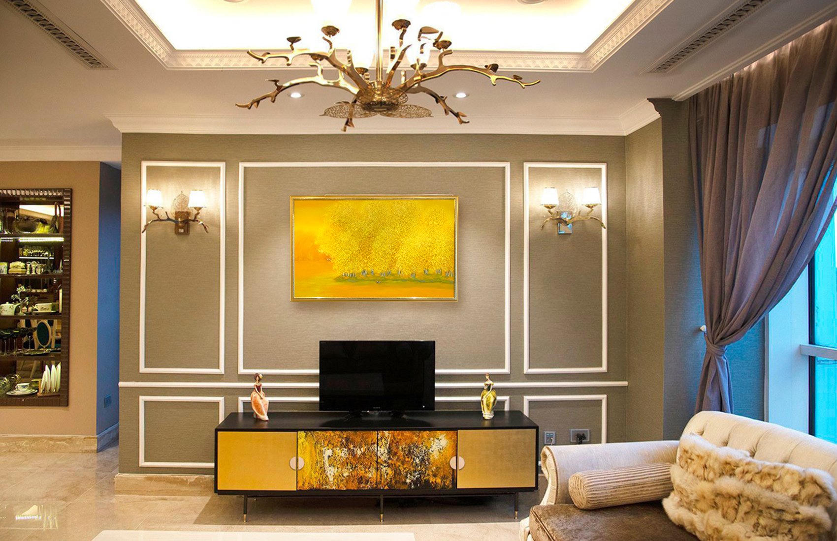 Khu vực sofa tiếp khách: Tủ TV màu gold tone-sur-tone với bức tranh.