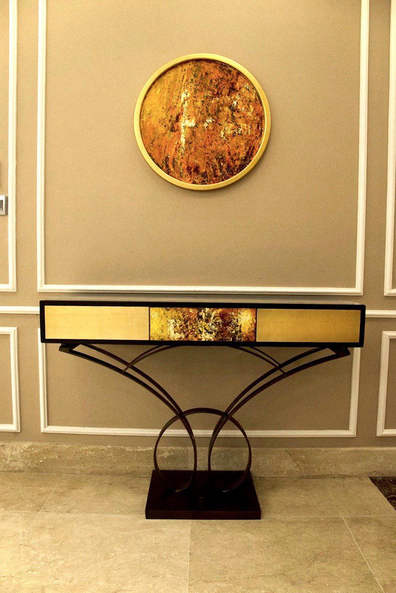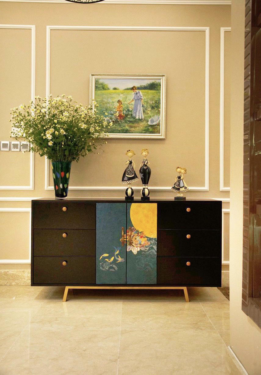 Bàn Console trang trí khu sảnh welcome được trang trí 1 bức tranh sơn mài cùng họa tiết để lấp khoảng trống phần tường.