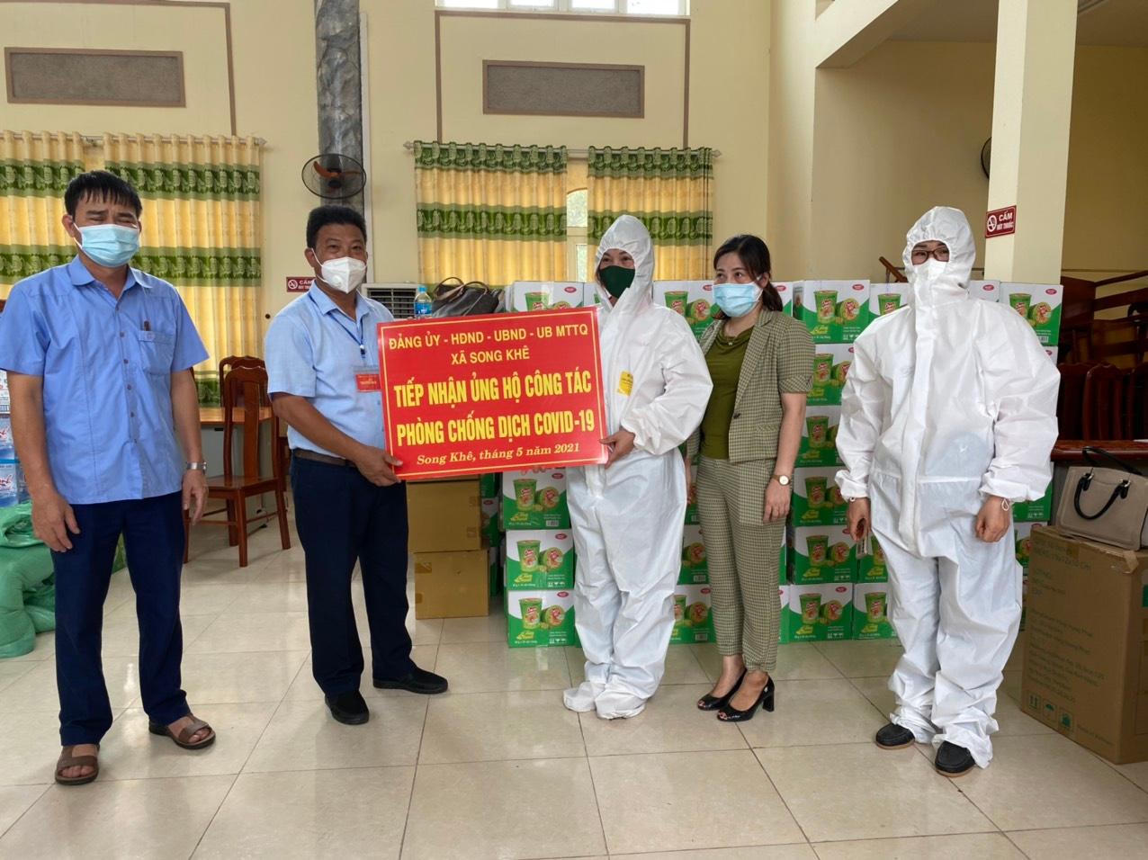 Tại xã Song Khê (TP Bắc Giang, tỉnh Bắc Giang), đoàn cũng trao tặng: 8.400 chiếc khẩu trang y tế; 540 bộ đồ bảo hộ; 200 thùng mỳ tôm cốc; 100 thùng mỳ tôm gói; 100 chai nước rửa tay; 700 hộp thực phẩm bảo vệ sức khỏe; 100 triệu đồng.