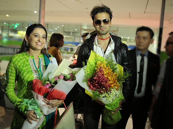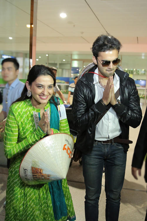 Avinash và 'mẹ' - diễn viên Smita cùng chào truyền thông khán giả. Vừa trải qua chuyến bay khá dài nhưng Smita vẫn rạng rỡ. Nữ diễn viên diện trang phục truyền thống của Ấn Độ.