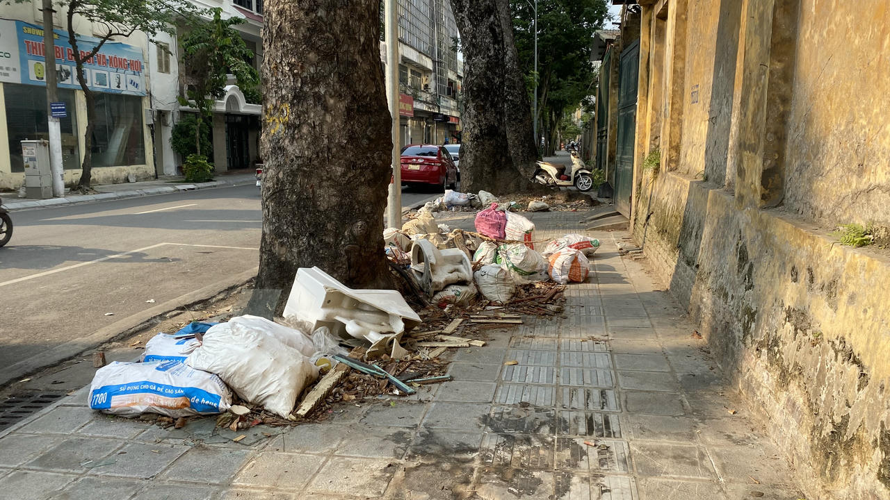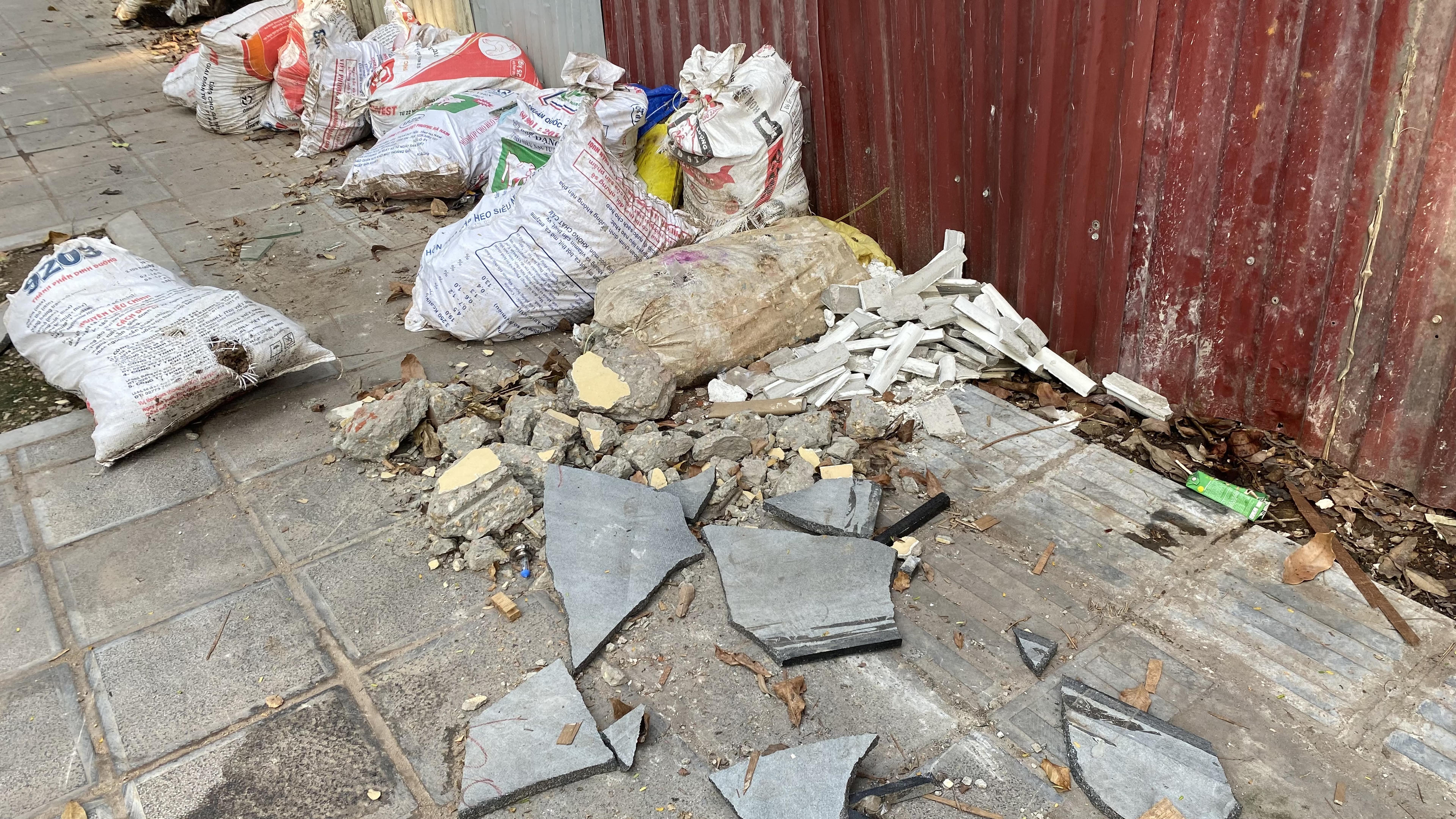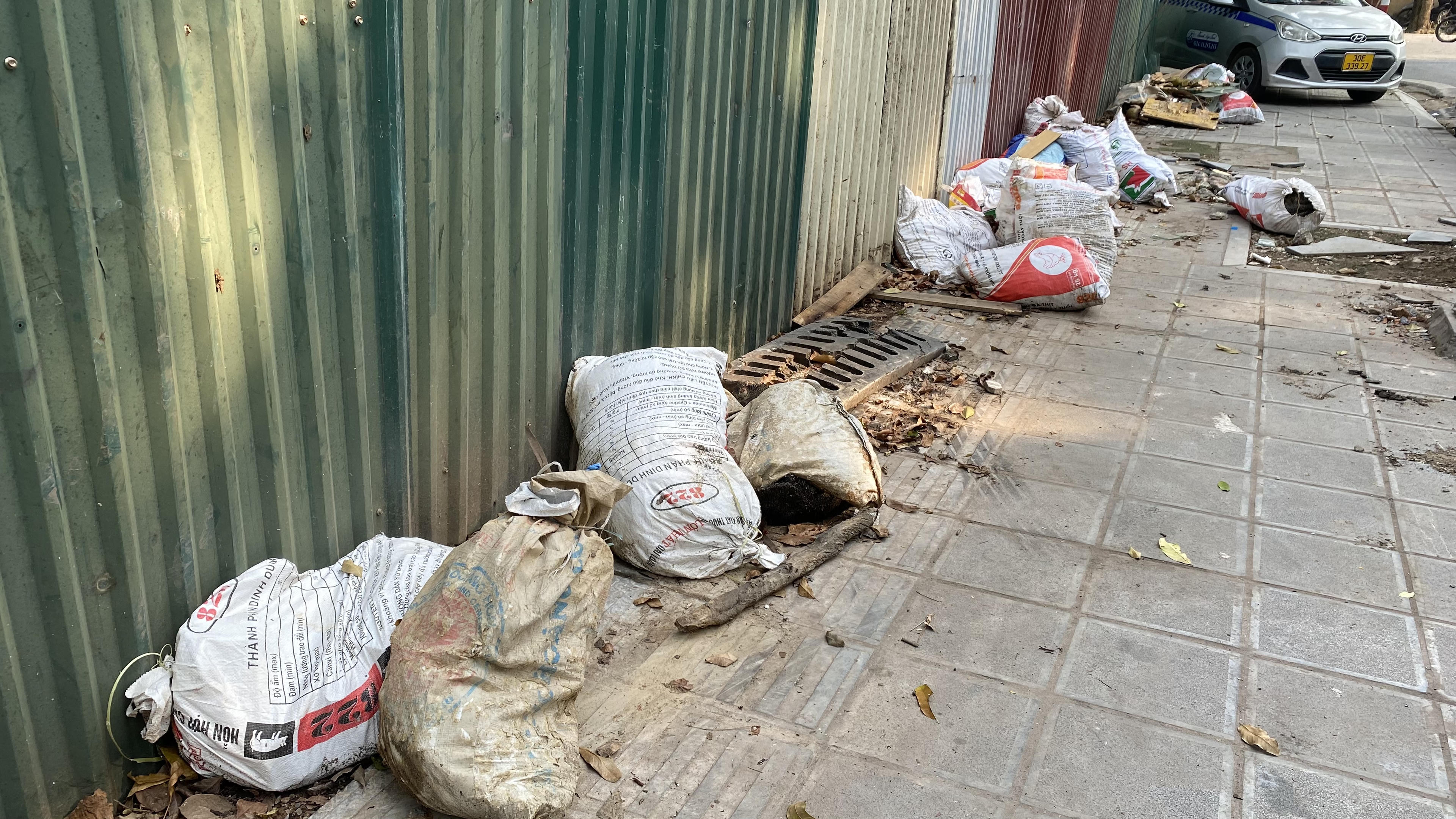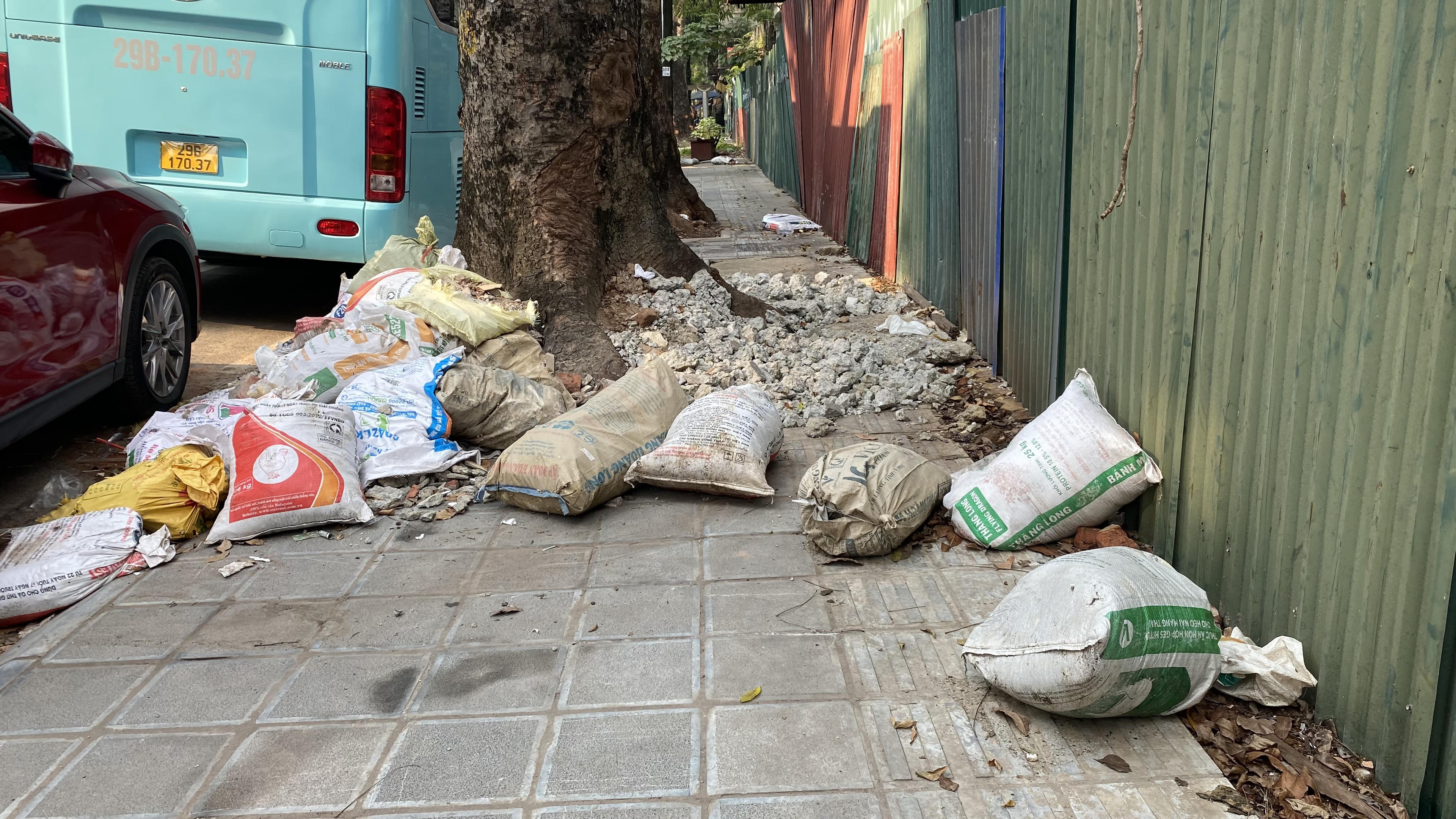Đặc biệt đoạn vỉa hè phố Trần Thánh Tông, từ khu vực quây rào khu đất mở rộng Nhà tang lễ quốc gia, những bao rác thải chất đống, ngổn ngang. Rác thải chủ yếu là vật liệu xây dựng, gạch đá vỡ, thậm chí cả bệt vệ sinh cũ cũng được "tập kết" dọc tuyến đường.