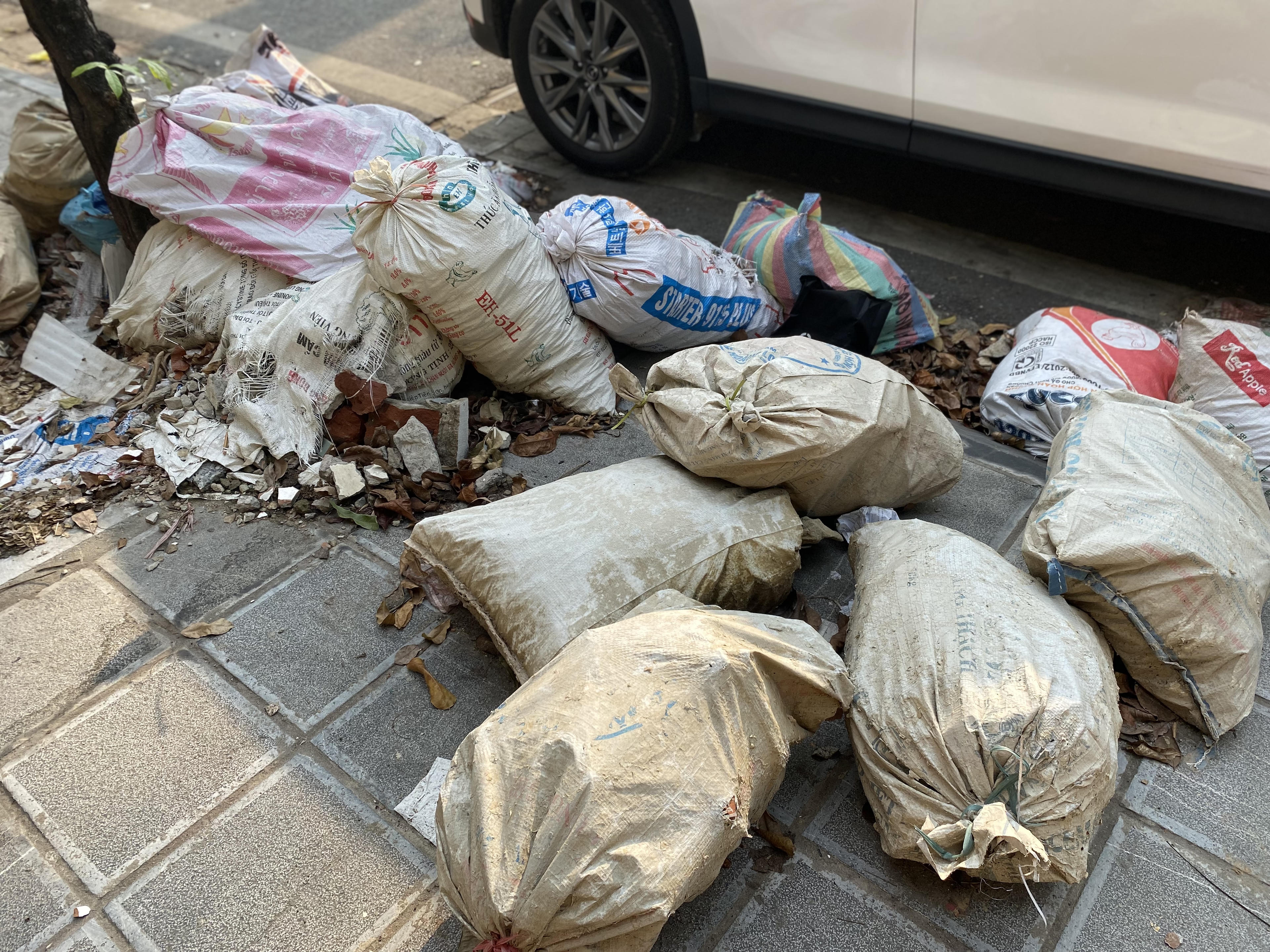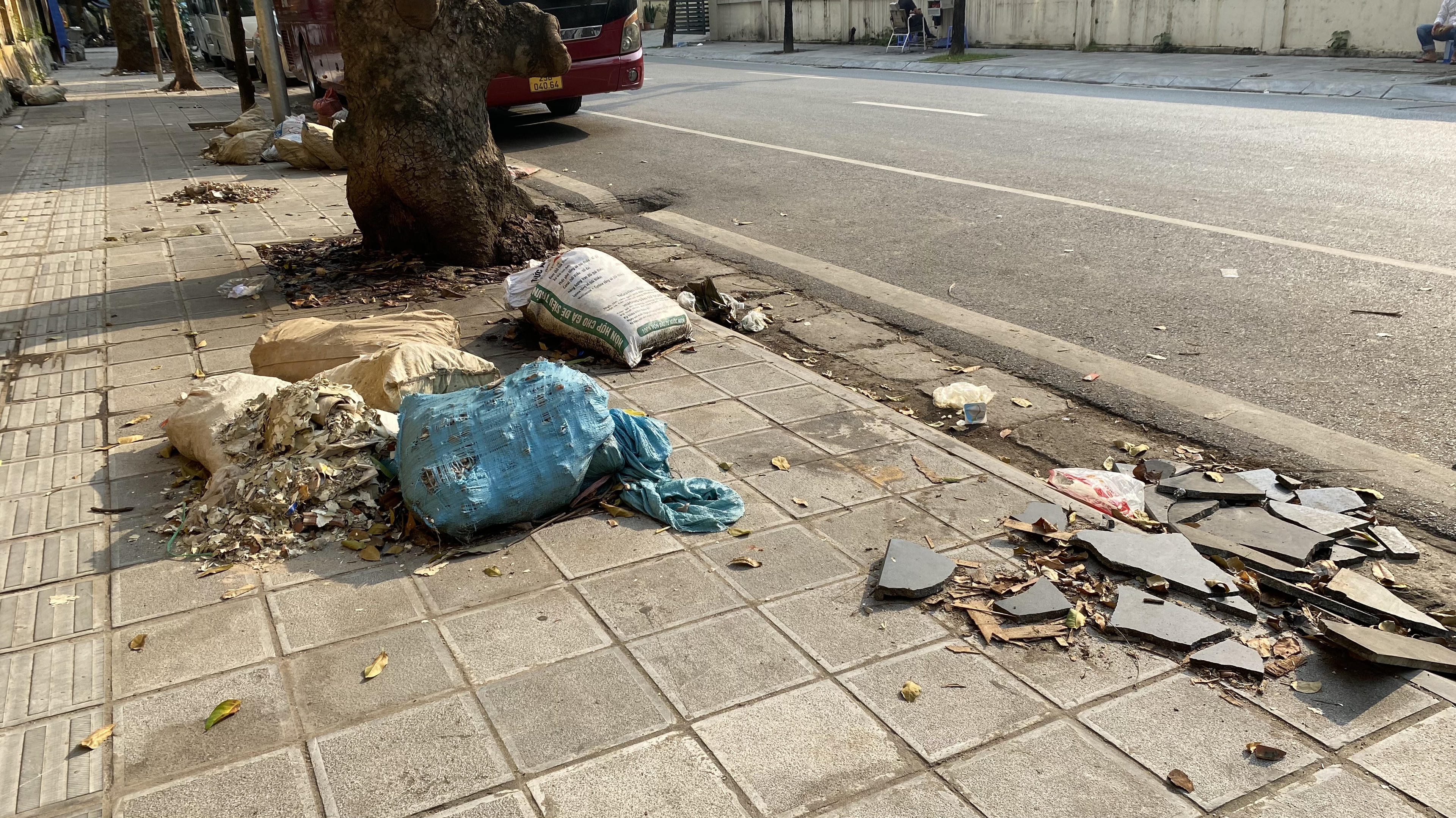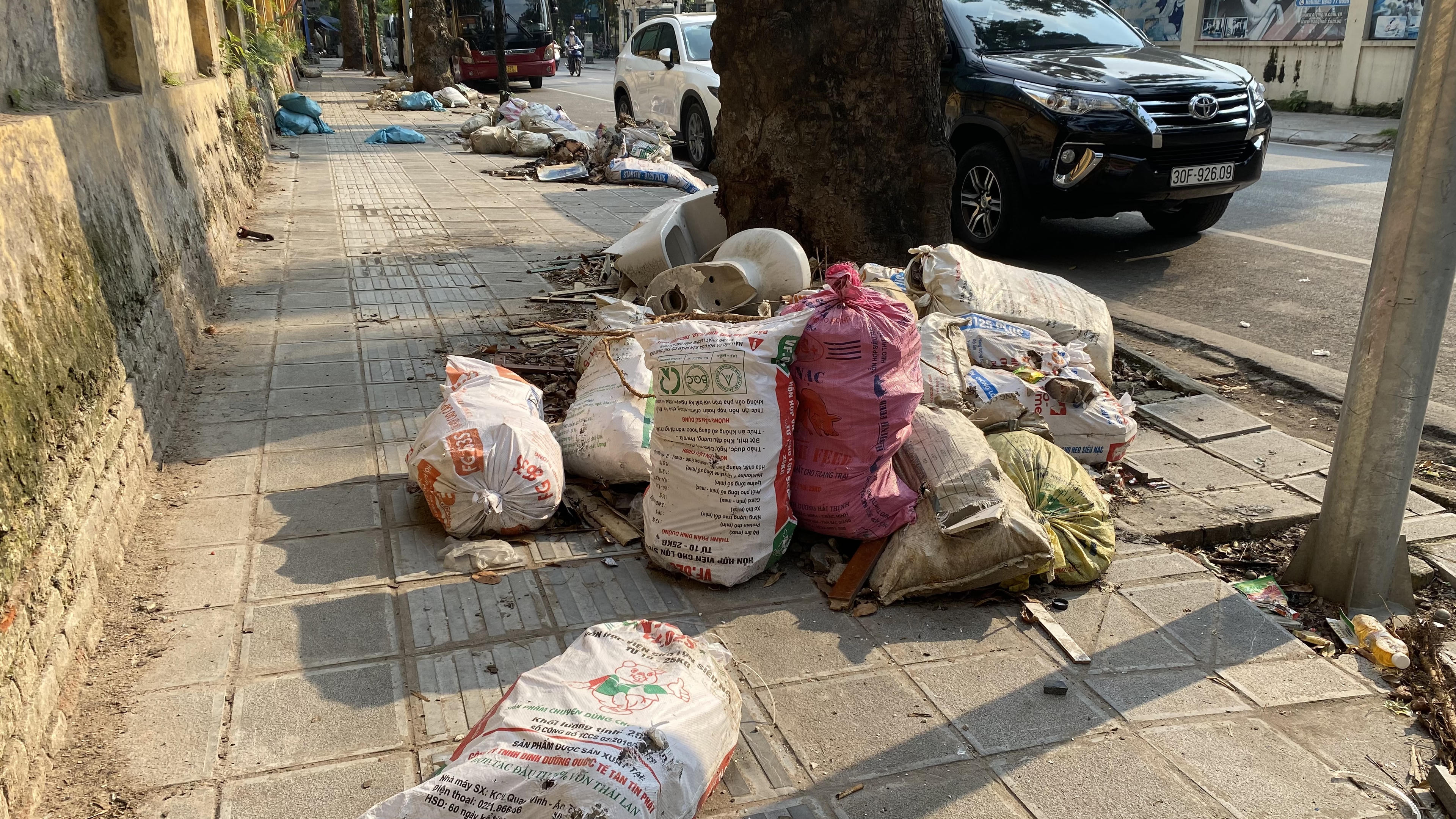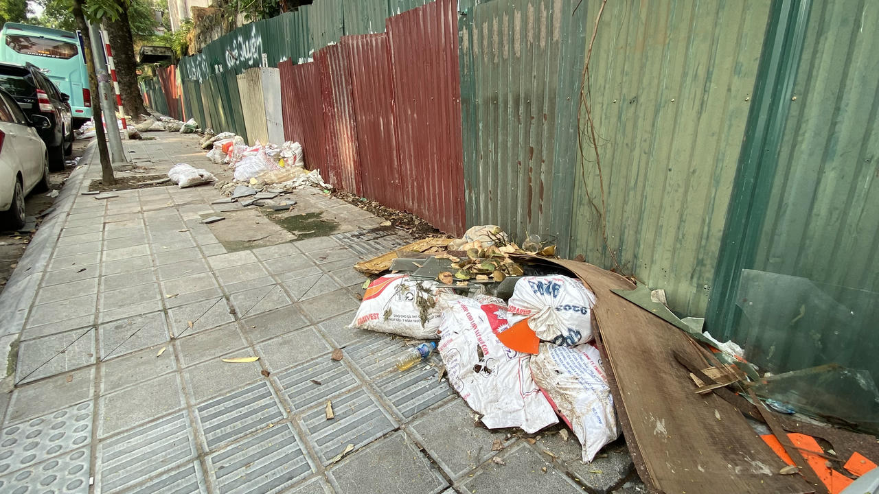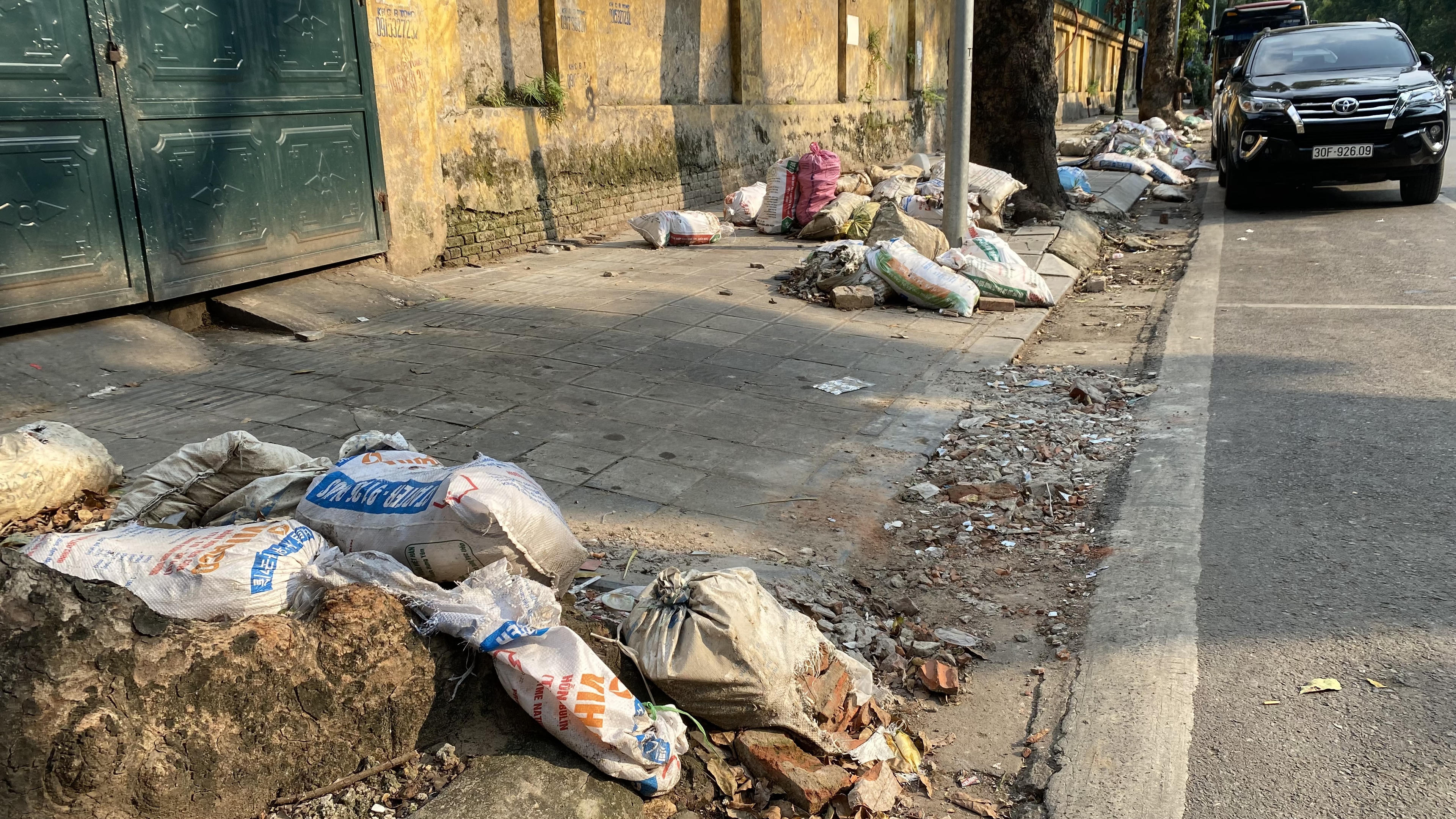 Đặc biệt đoạn vỉa hè phố Trần Thánh Tông, từ khu vực quây rào khu đất mở rộng Nhà tang lễ quốc gia, những bao rác thải chất đống, ngổn ngang. Rác thải chủ yếu là vật liệu xây dựng, gạch đá vỡ, thậm chí cả bệt vệ sinh cũ cũng được "tập kết" dọc tuyến đường.
