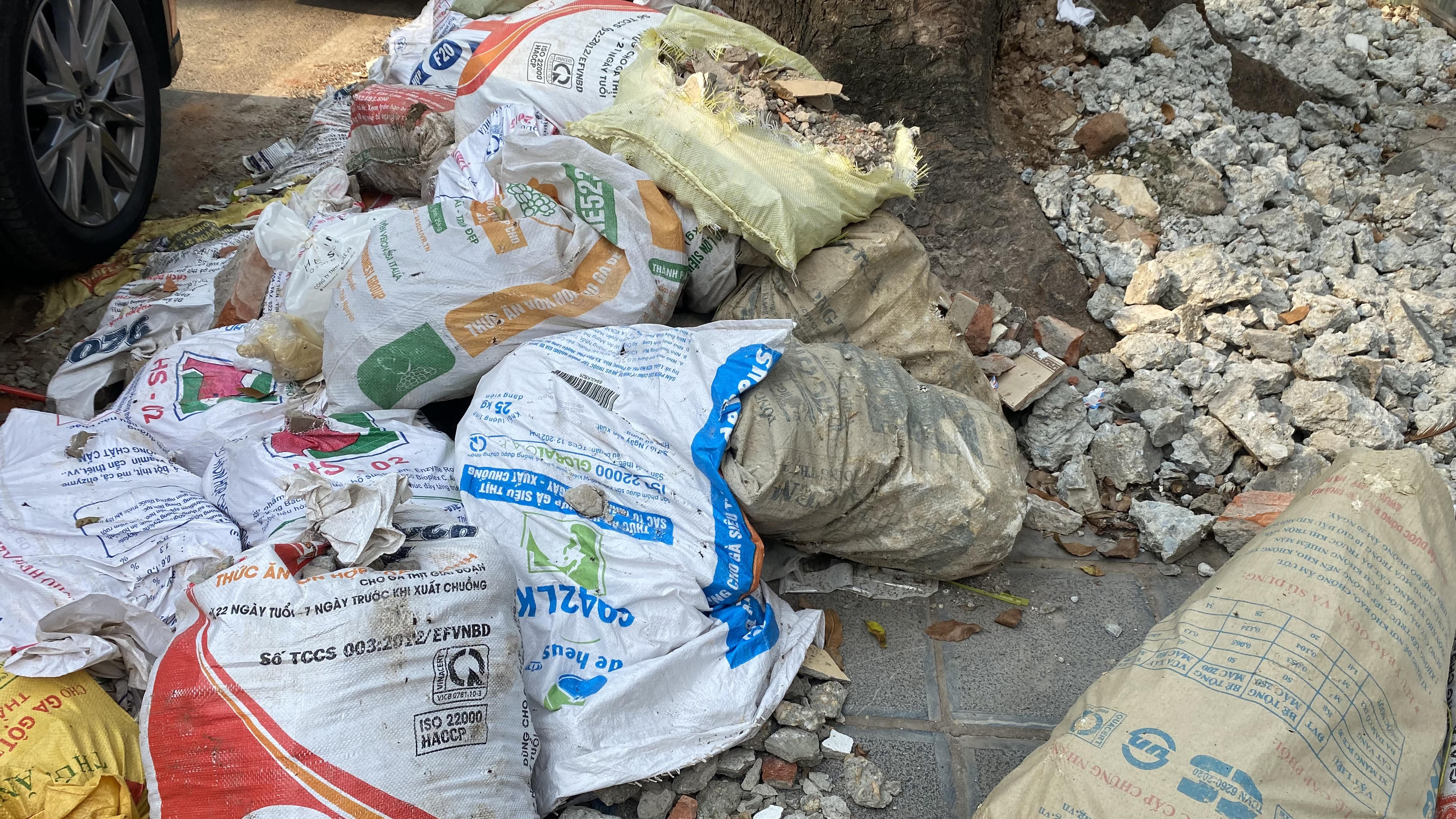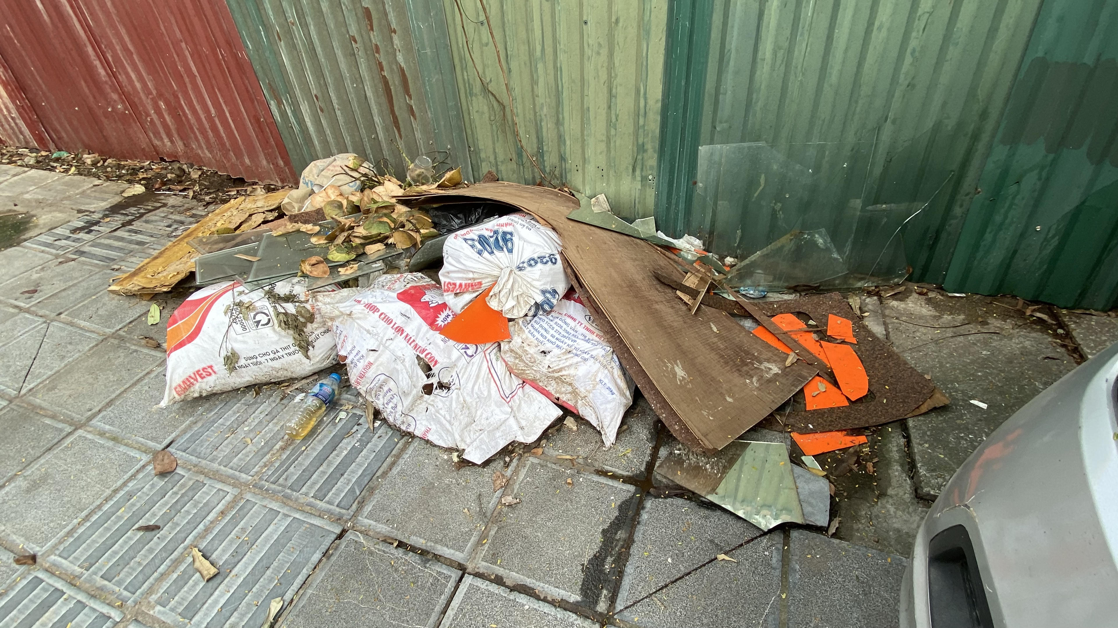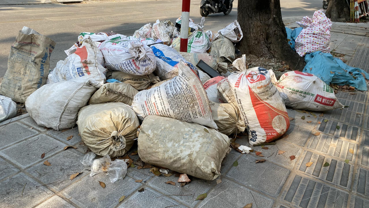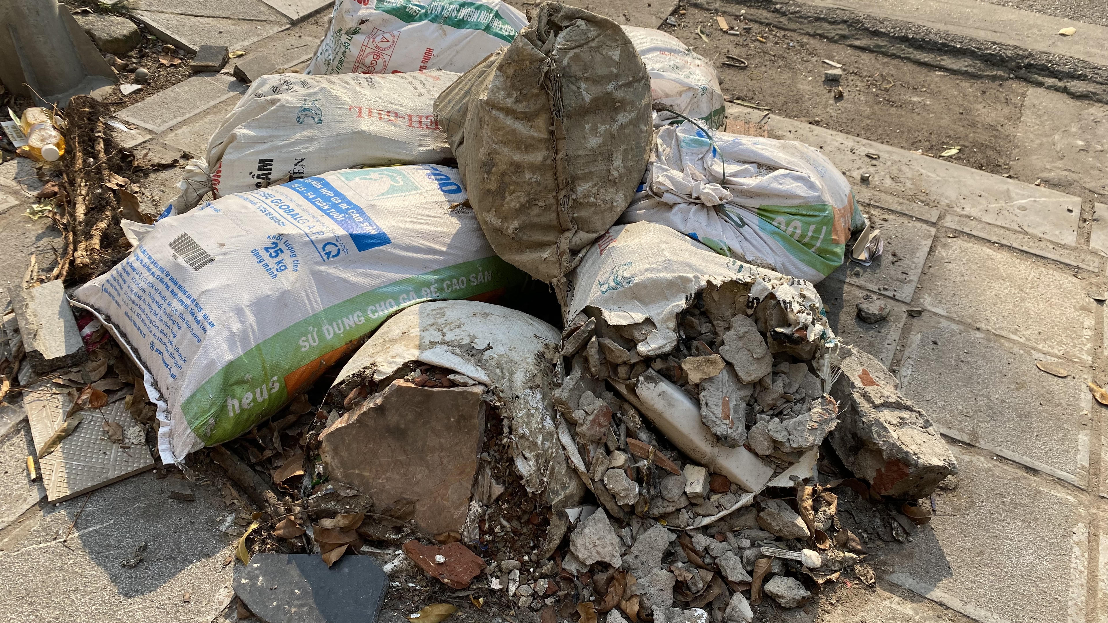 Đặc biệt đoạn vỉa hè phố Trần Thánh Tông, từ khu vực quây rào khu đất mở rộng Nhà tang lễ quốc gia, những bao rác thải chất đống, ngổn ngang. Rác thải chủ yếu là vật liệu xây dựng, gạch đá vỡ, thậm chí cả bệt vệ sinh cũ cũng được "tập kết" dọc tuyến đường.