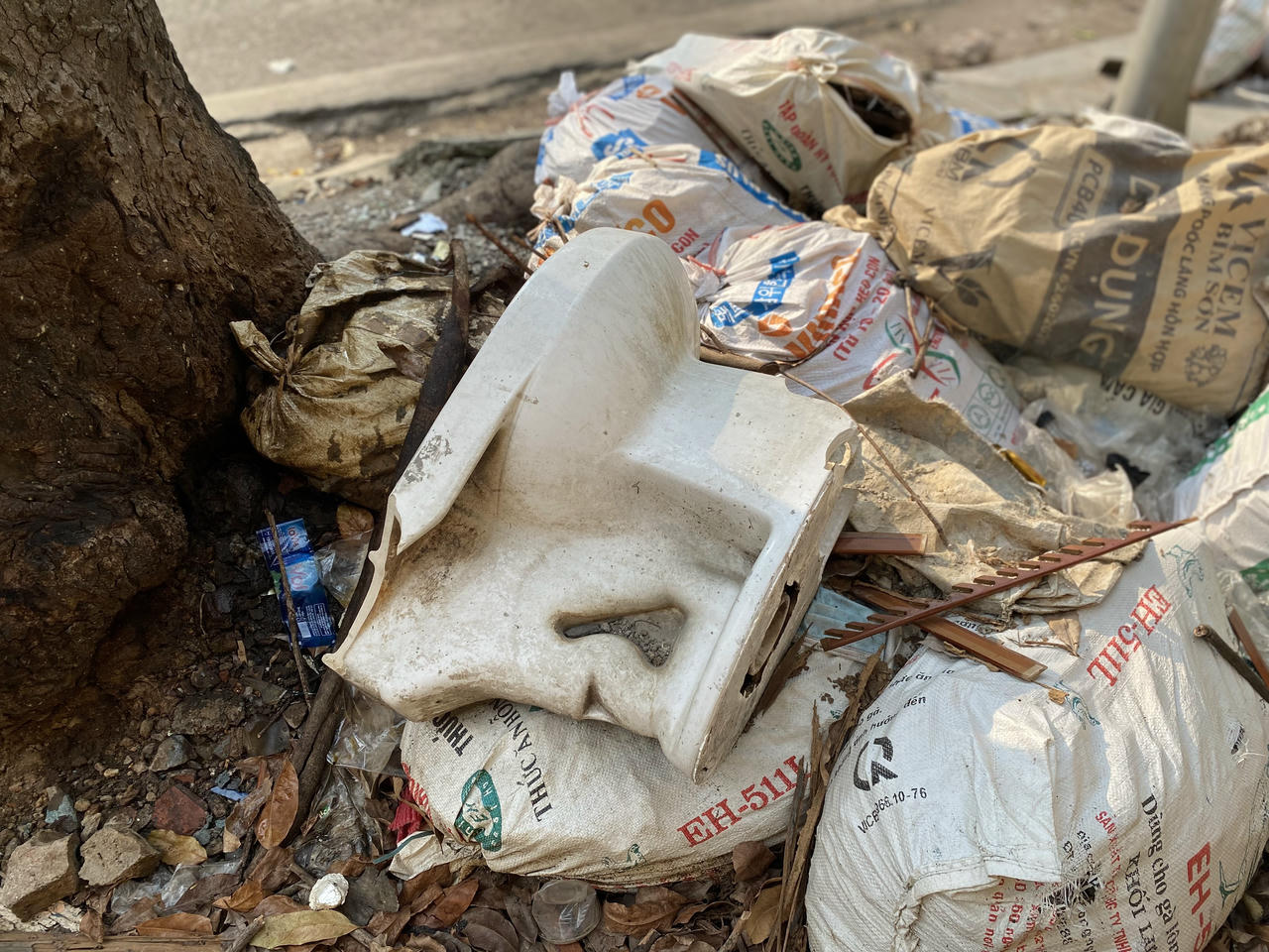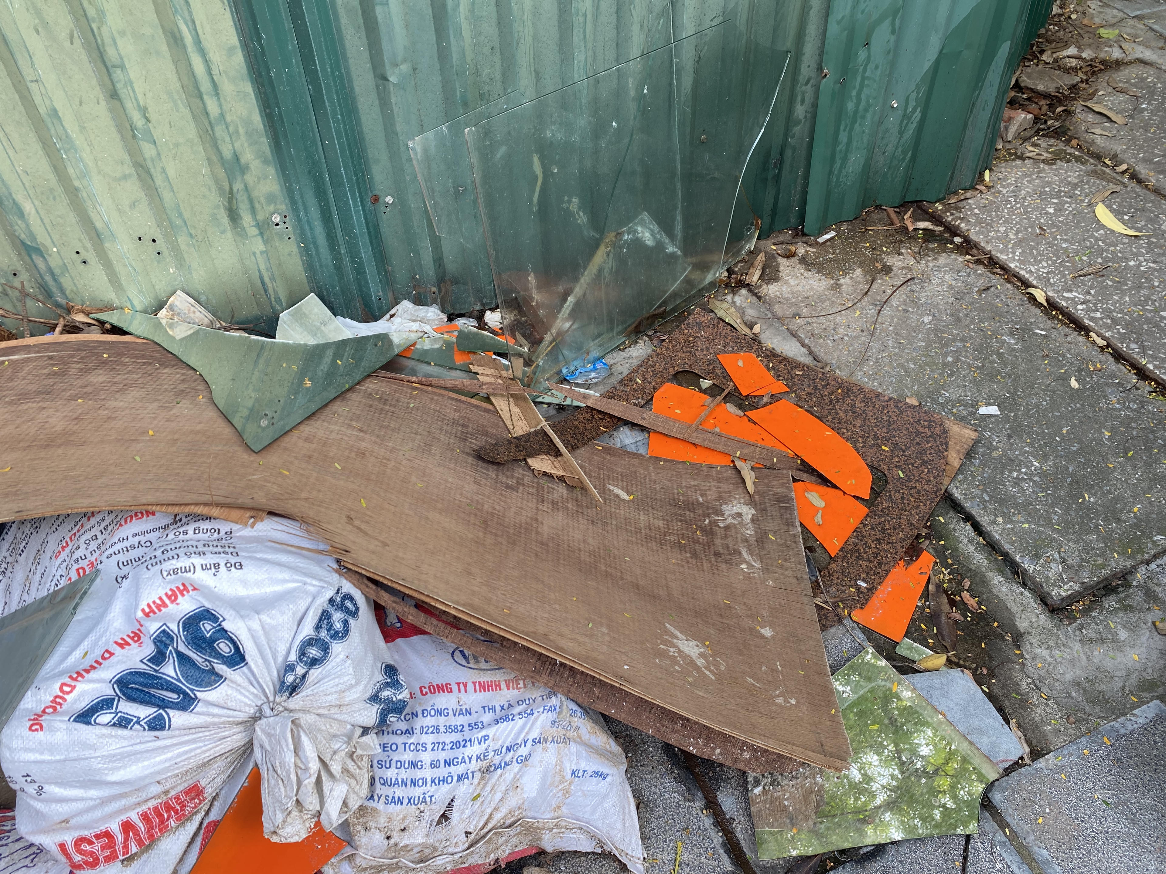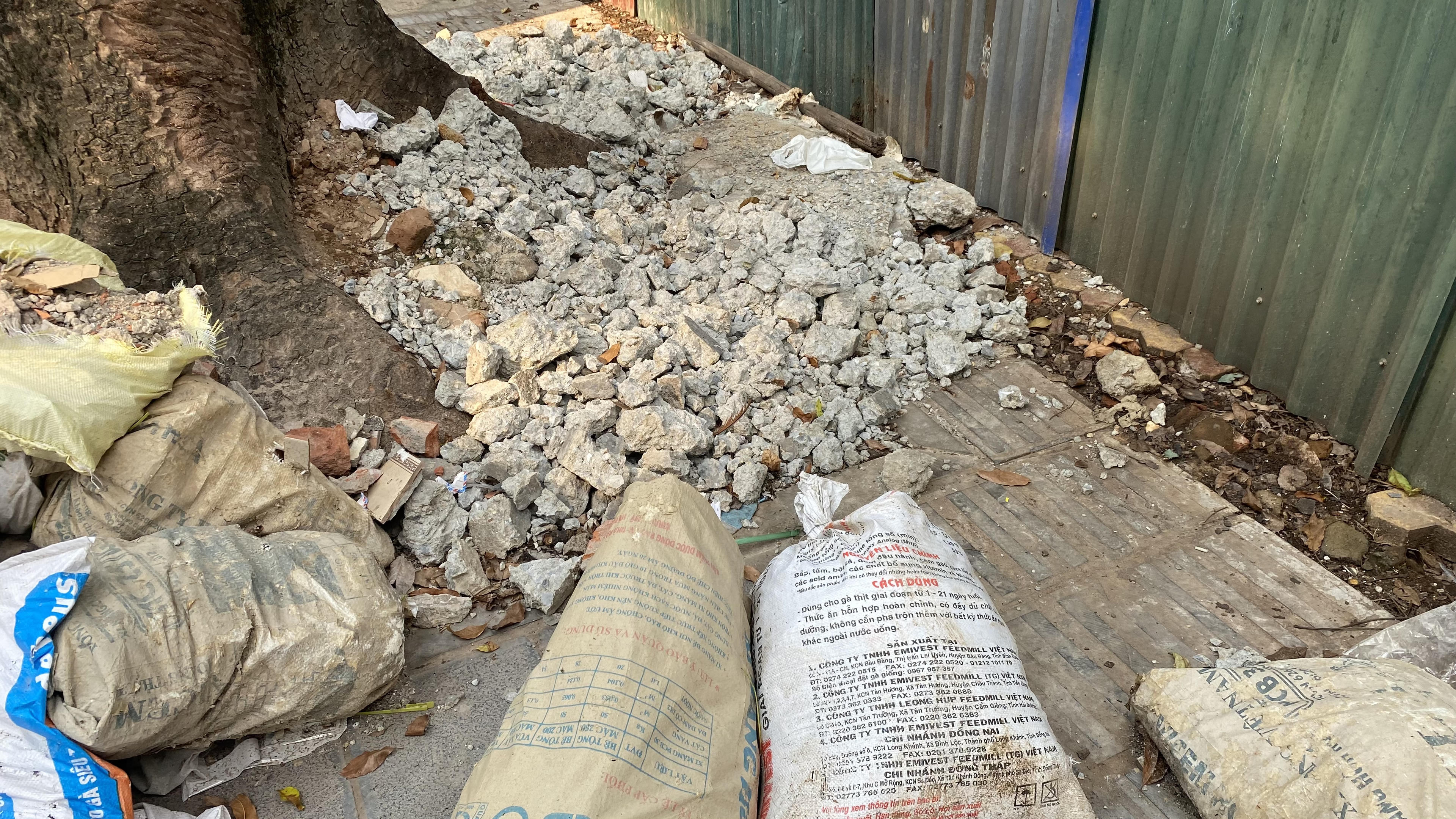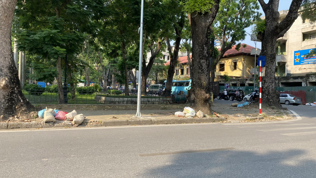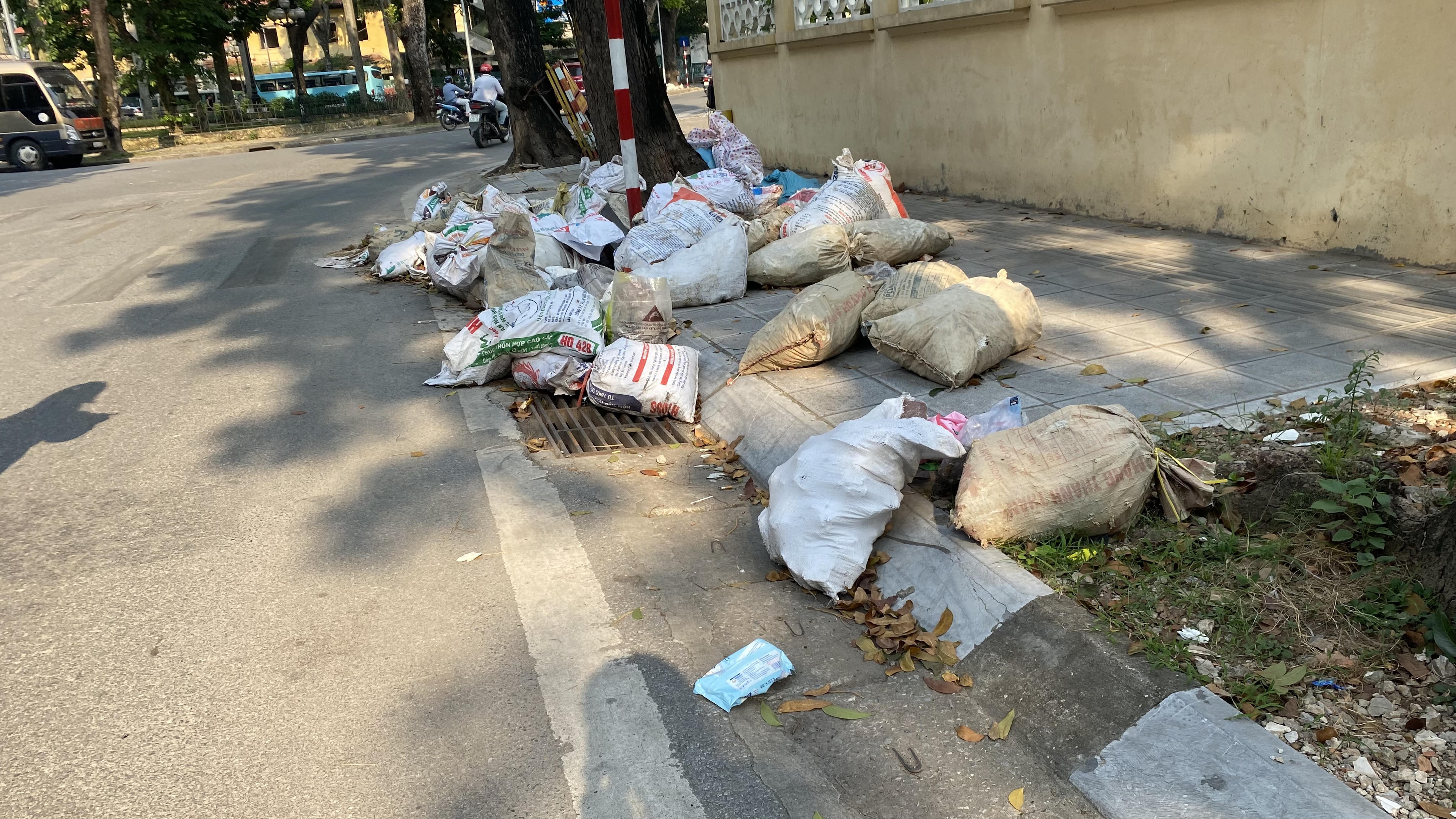 Đặc biệt đoạn vỉa hè phố Trần Thánh Tông, từ khu vực quây rào khu đất mở rộng Nhà tang lễ quốc gia, những bao rác thải chất đống, ngổn ngang. Rác thải chủ yếu là vật liệu xây dựng, gạch đá vỡ, thậm chí cả bệt vệ sinh cũ cũng được "tập kết" dọc tuyến đường.