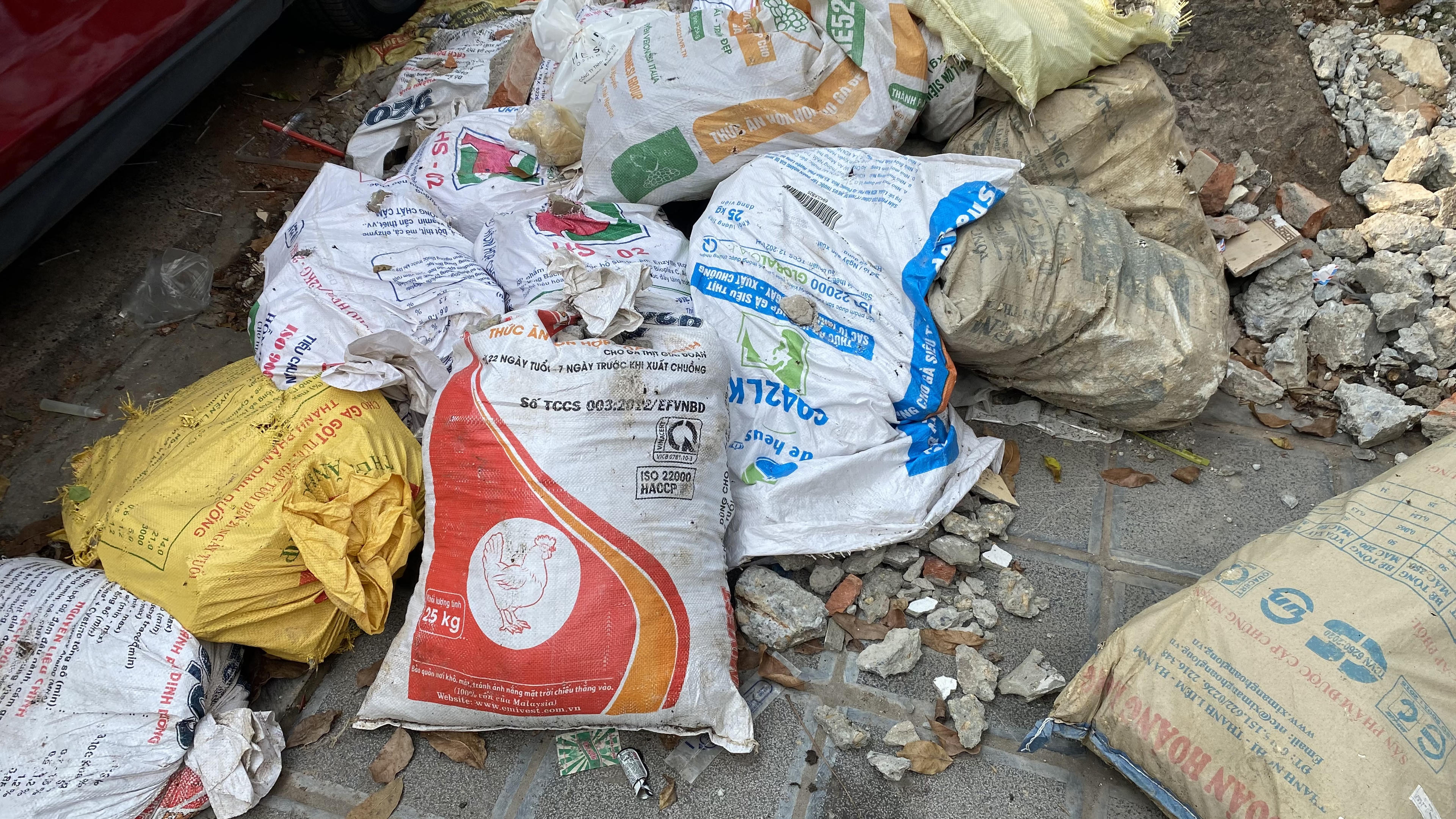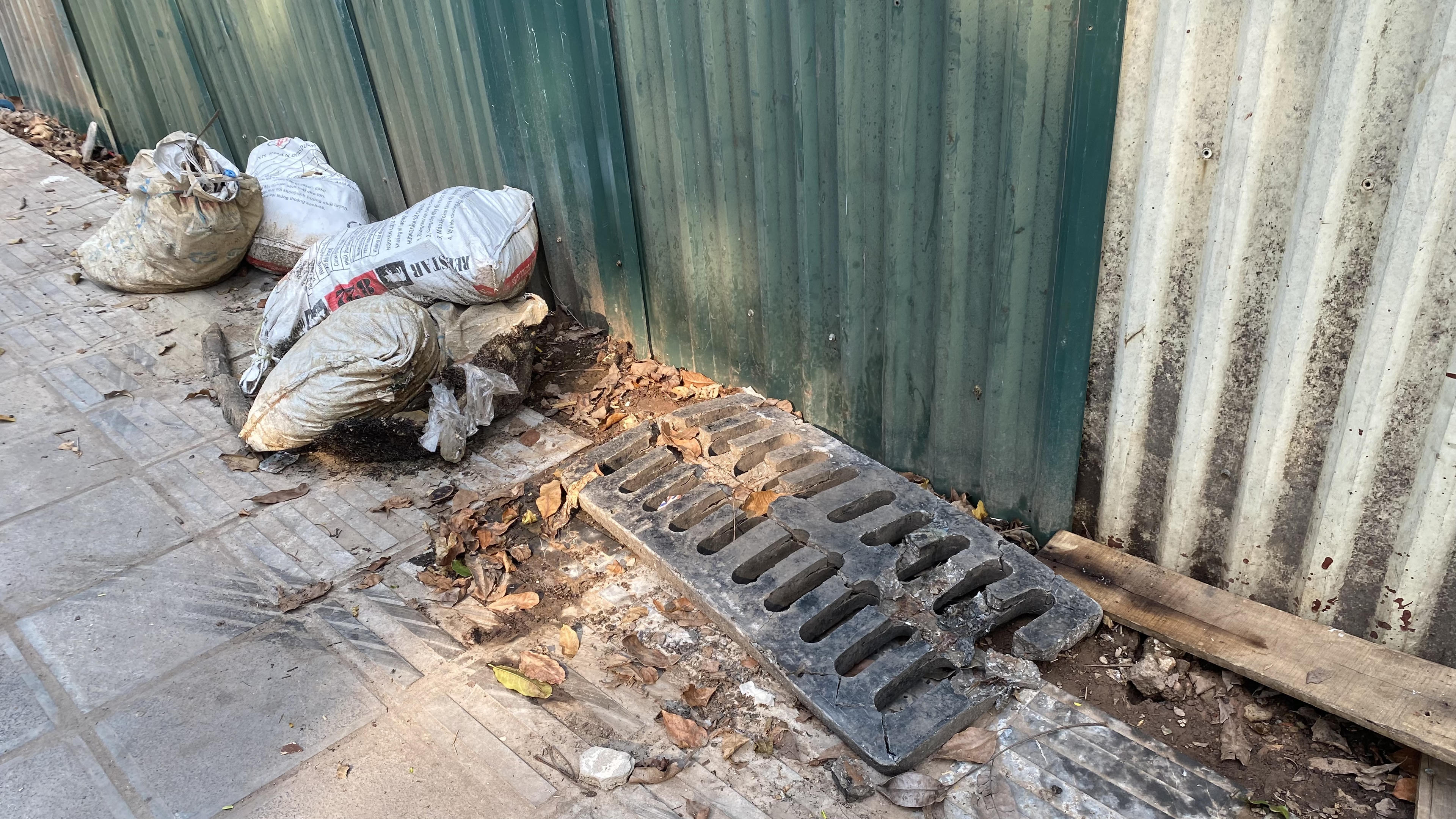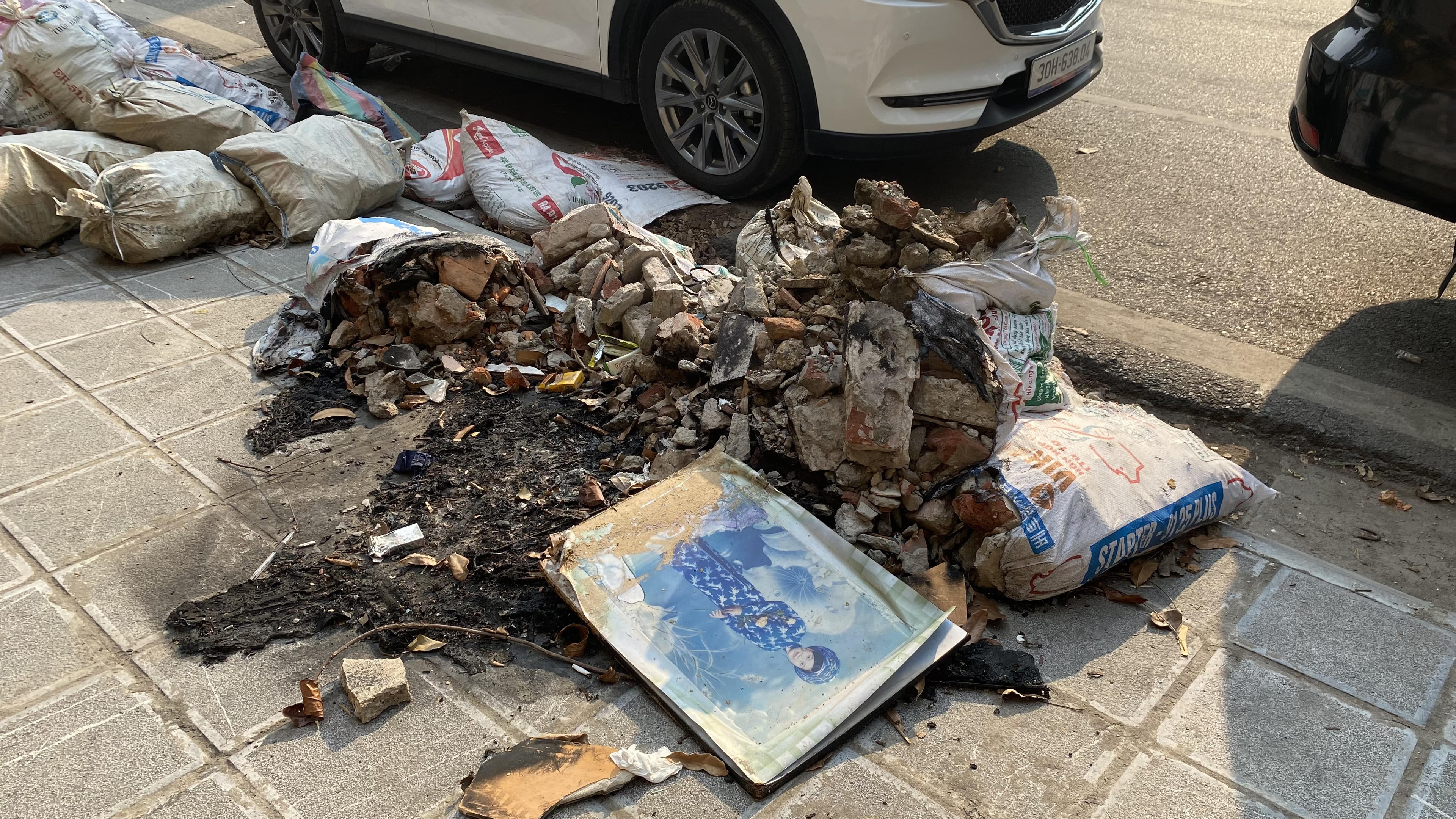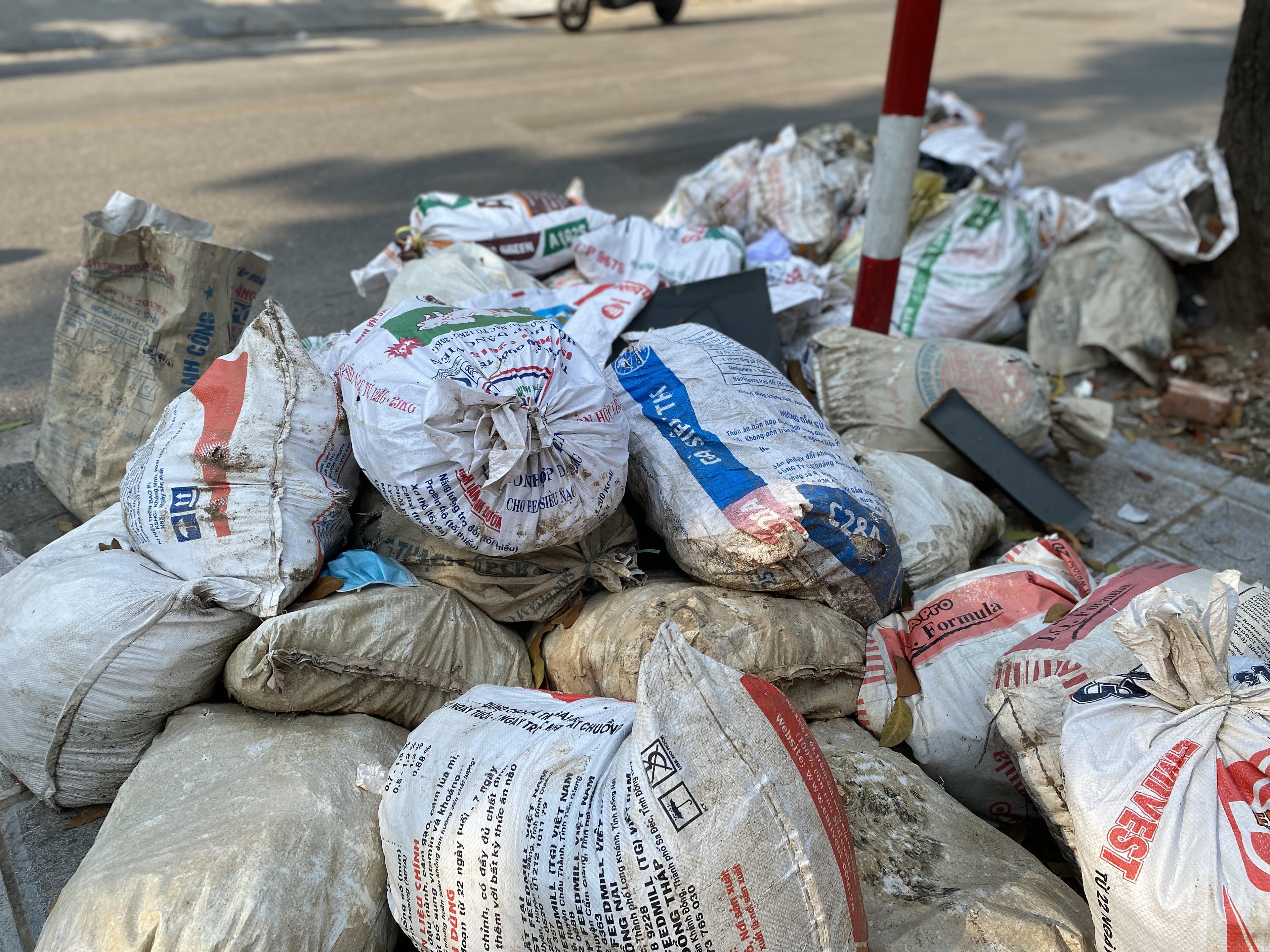Đặc biệt đoạn vỉa hè phố Trần Thánh Tông, từ khu vực quây rào khu đất mở rộng Nhà tang lễ quốc gia, những bao rác thải chất đống, ngổn ngang. Rác thải chủ yếu là vật liệu xây dựng, gạch đá vỡ, thậm chí cả bệt vệ sinh cũ cũng được "tập kết" dọc tuyến đường.