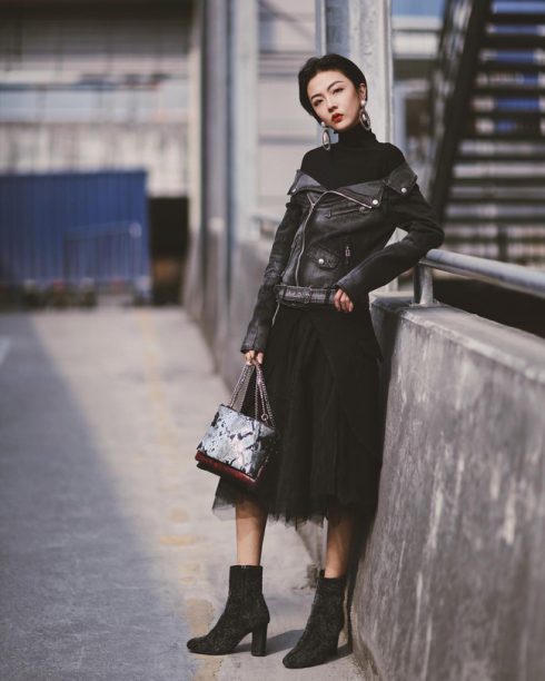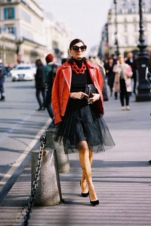 Vẻ đẹp kiêu kỳ của tulle kết hợp với áo khoác da sẽ đem đến cho set đồ của bạn sự pha trộn thú vị giữa nữ tính và táo bạo.