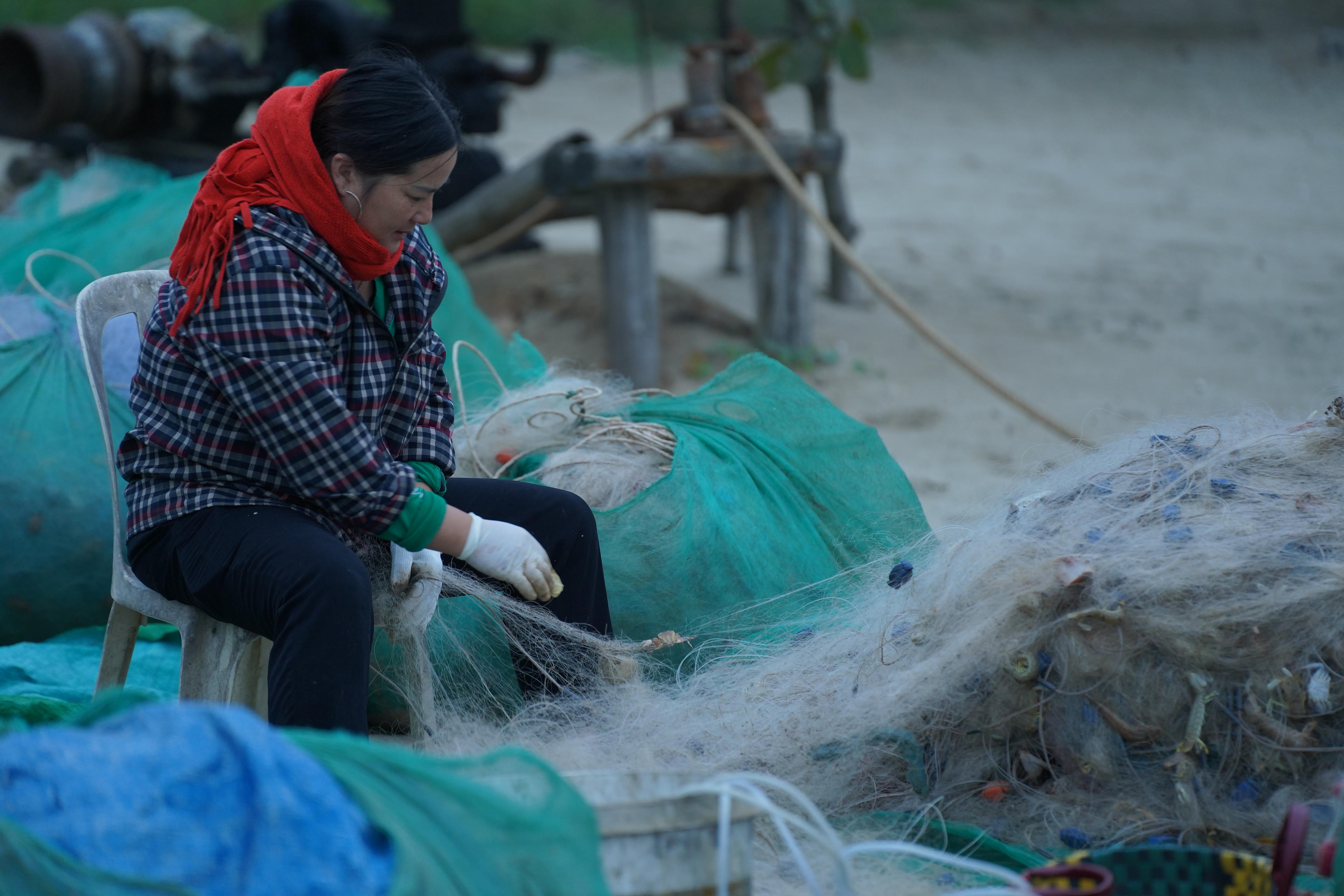 Trên bờ, người phụ nữ làng chài miệt mài gỡ lưới - Ảnh: Hương Giang |