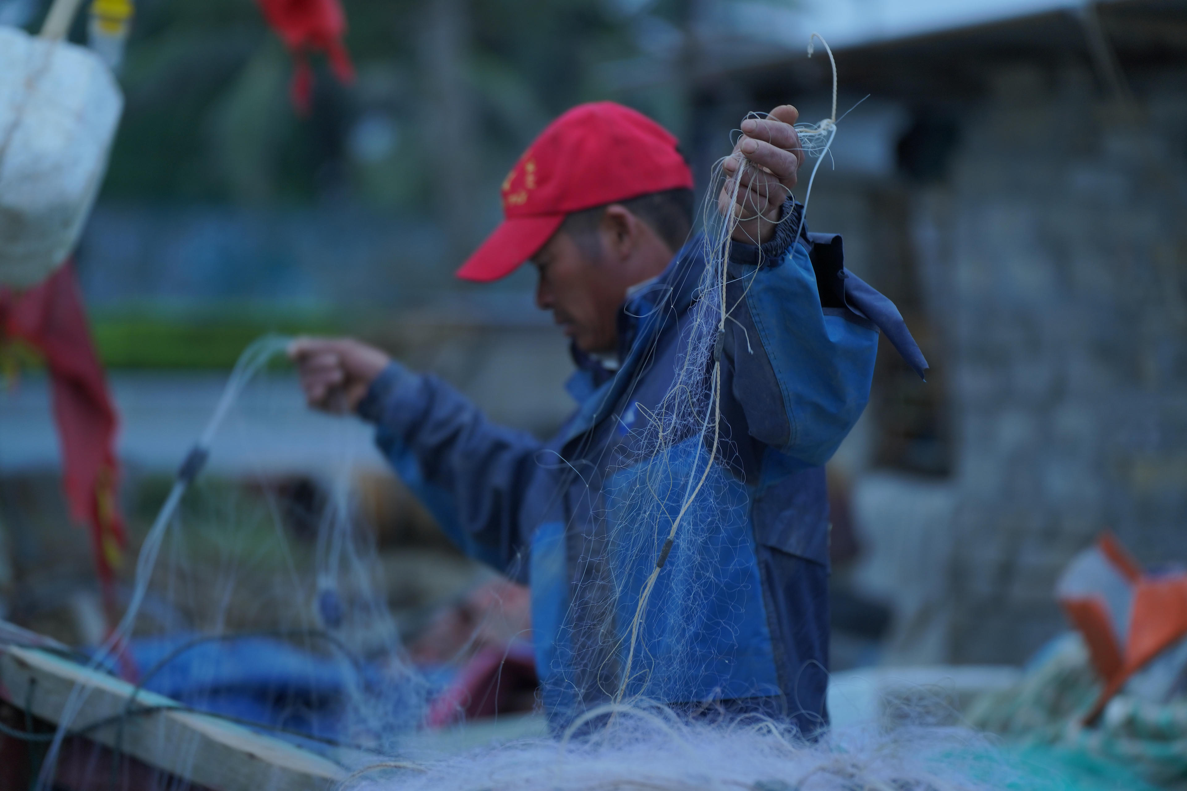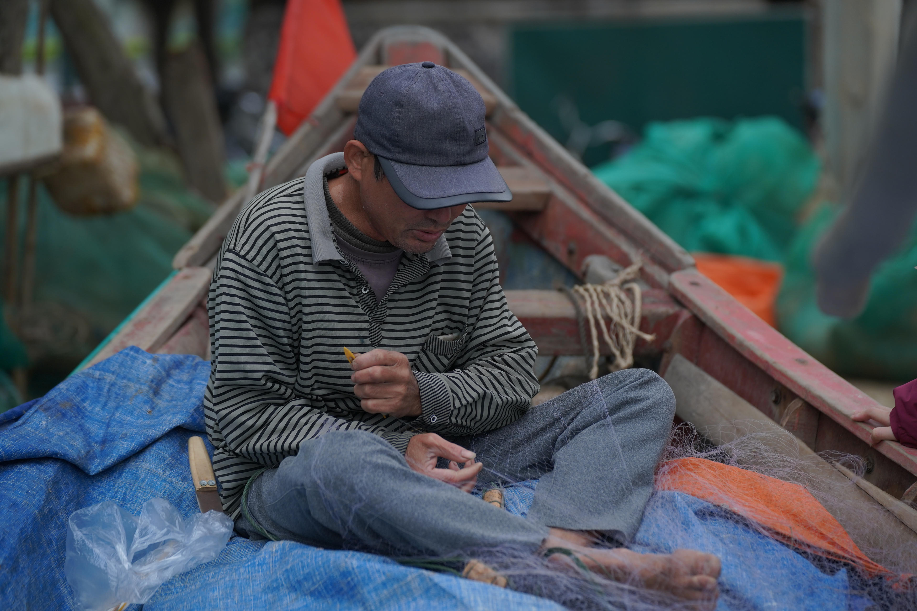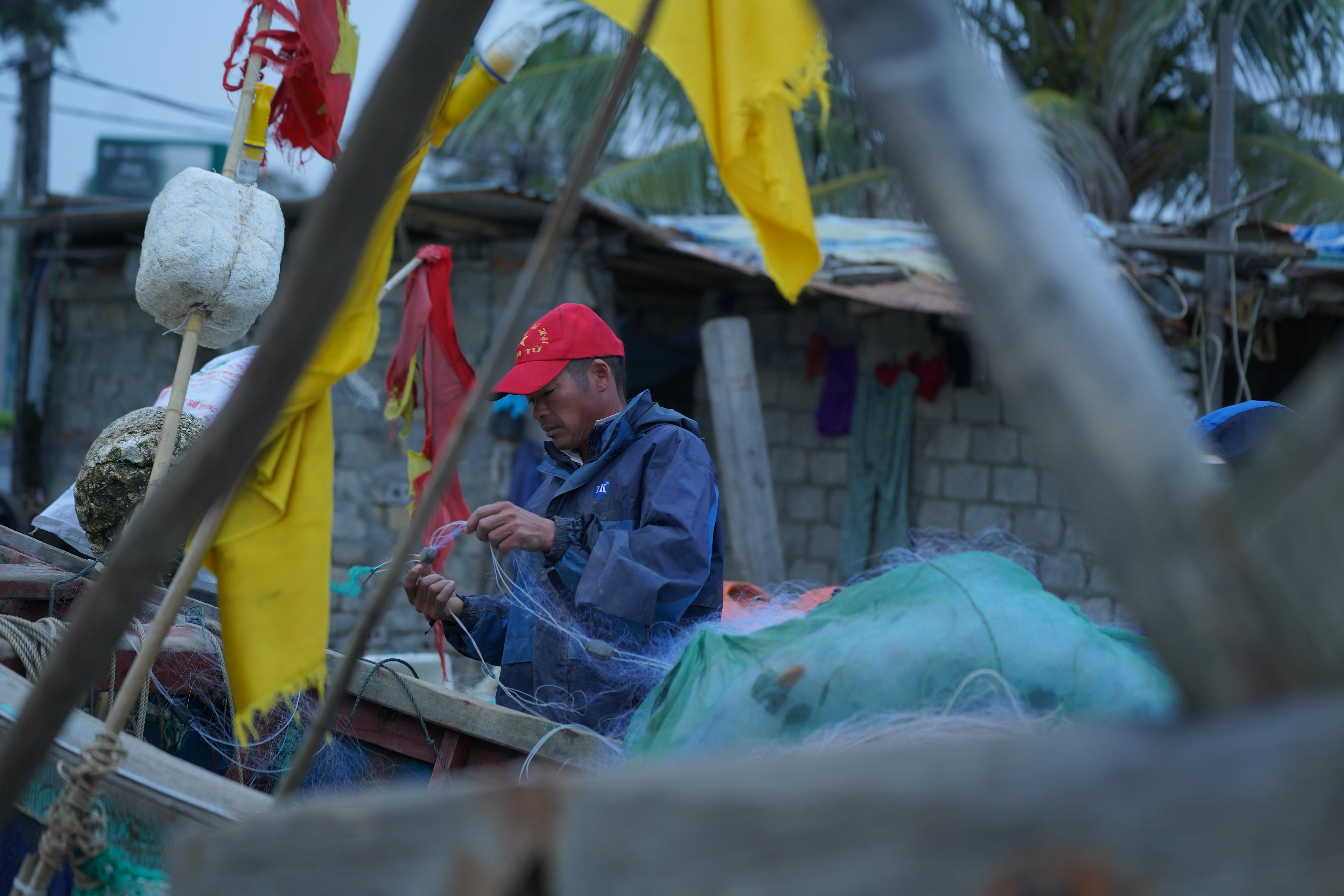 Người ngư dân kiểm tra lại lưới trước khi ra khơi - Ảnh: Hương Giang |