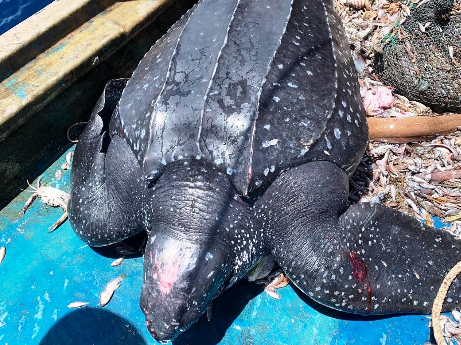 Đó là cá thể rùa da, thân màu đen dài hơn 1,6m, nặng gần 200kg. Cá thể rùa da này được kéo lên tàu. Sau đó, các ngư dân biết đây là loài động vật quý hiếm, cần được bảo tồn nên đã thả về biển.