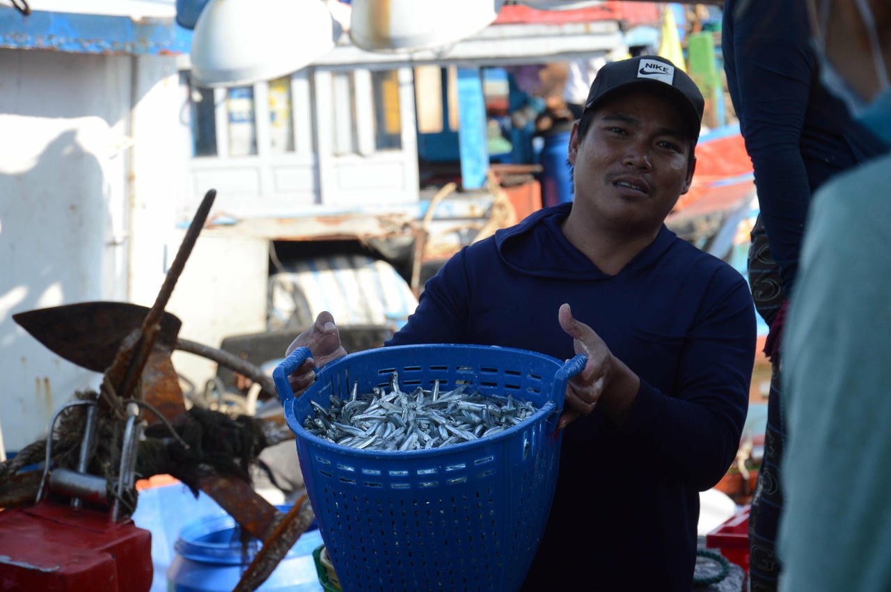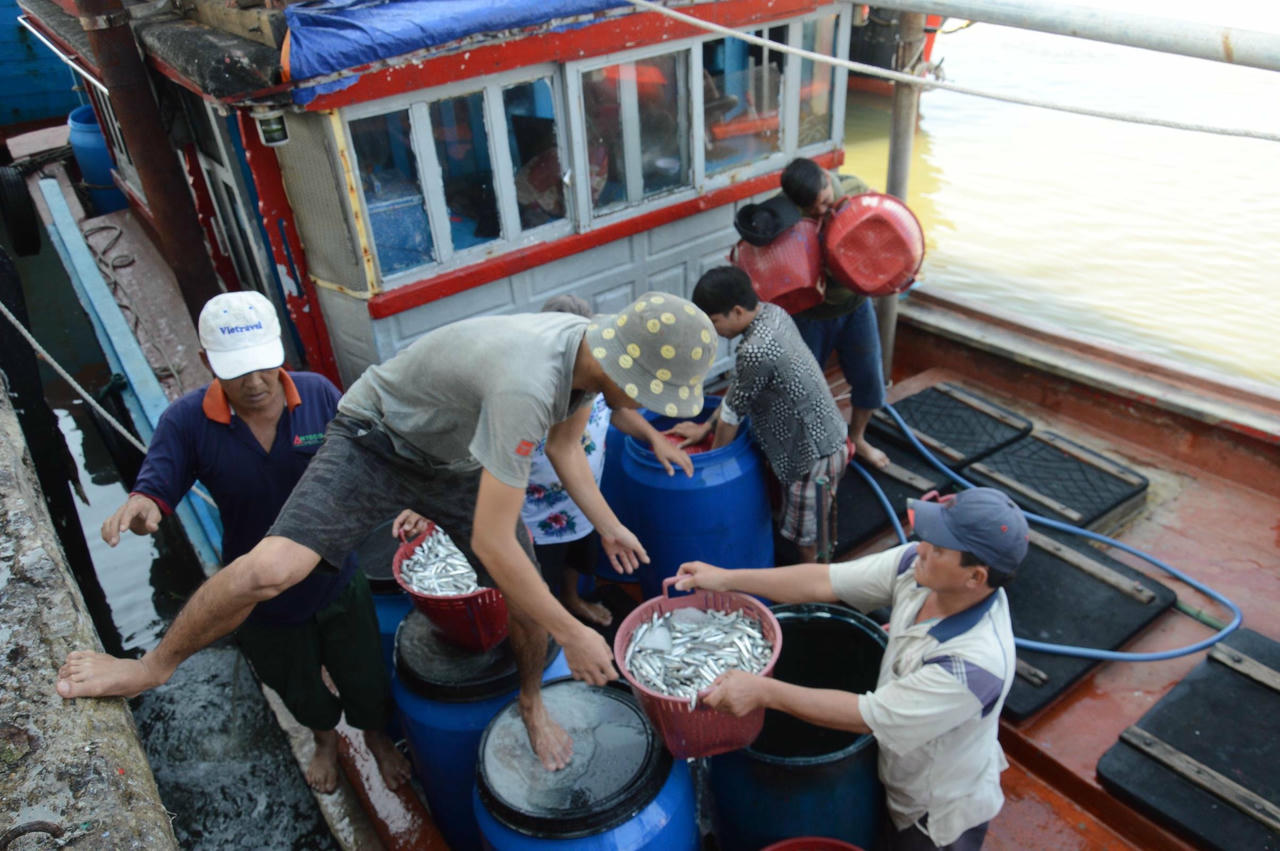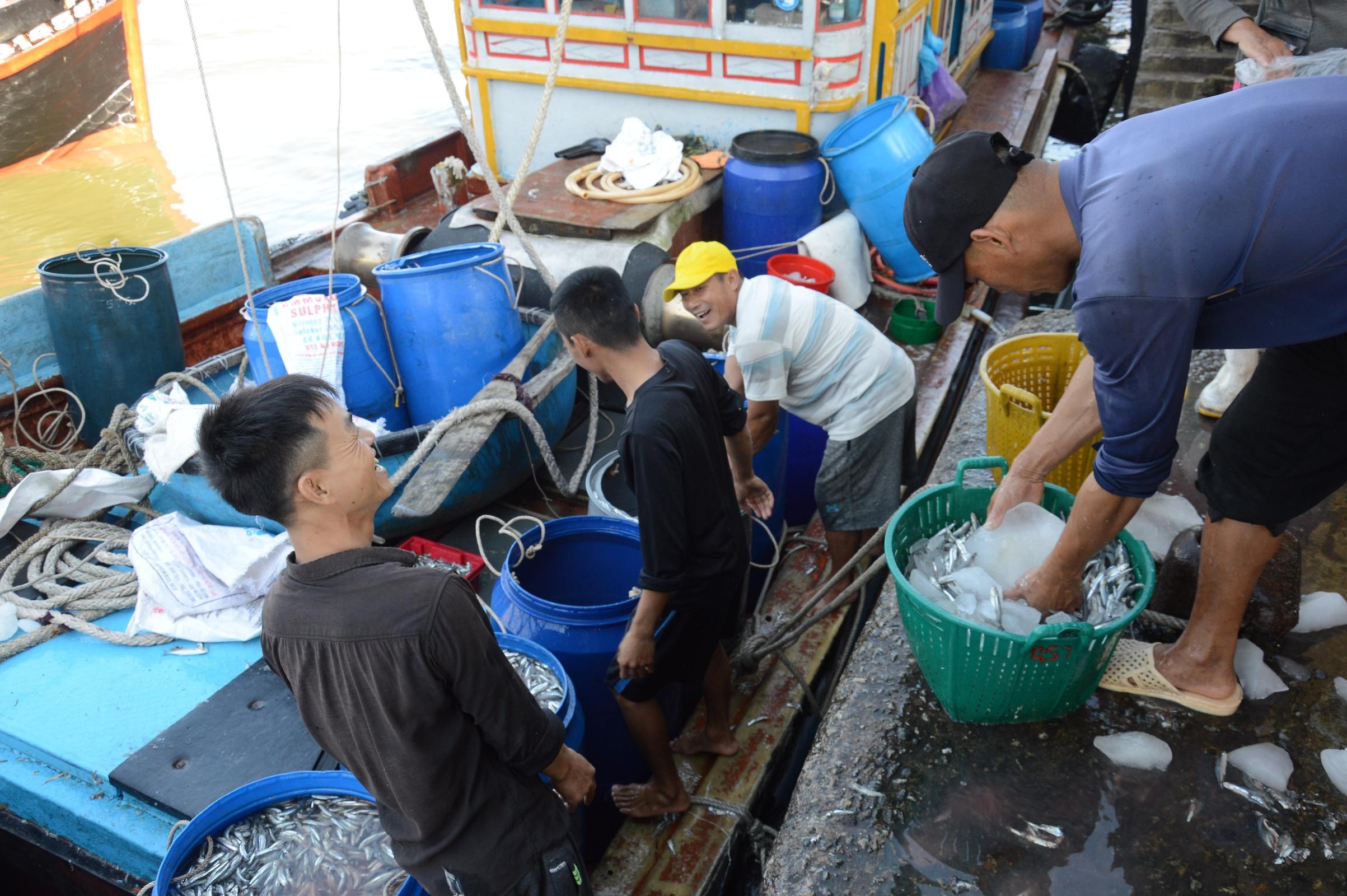 Thương lái thu mua cá cơm tại cảng Tịnh Kỳ. Theo các ngư dân, chuyến biển cuối năm nay không chỉ được mùa mà còn bán được giá.
