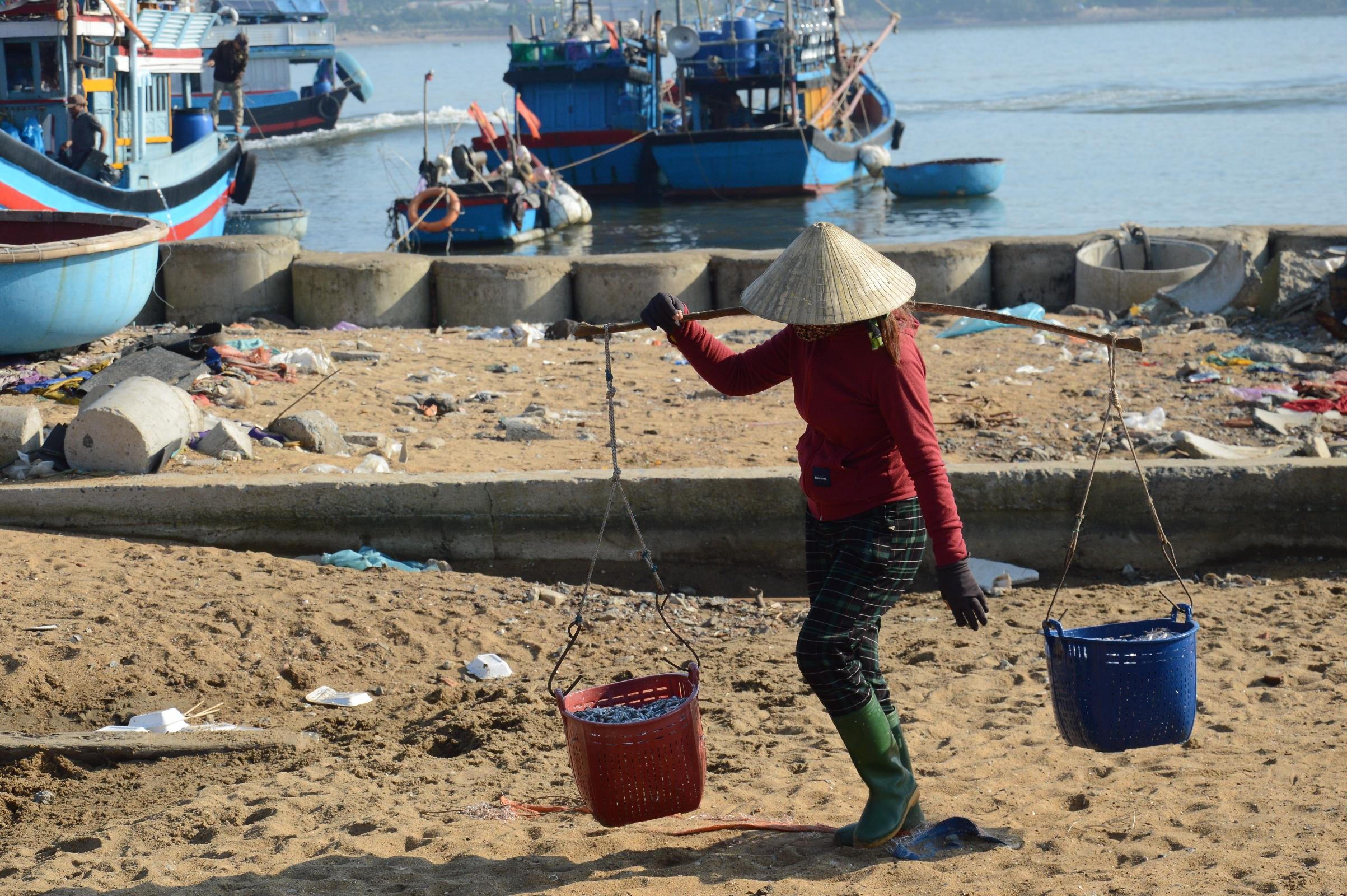Phụ nữ làng biển Tịnh Kỳ cũng có cơ hội kiếm thêm thu nhập từ việc gánh cá thuê.