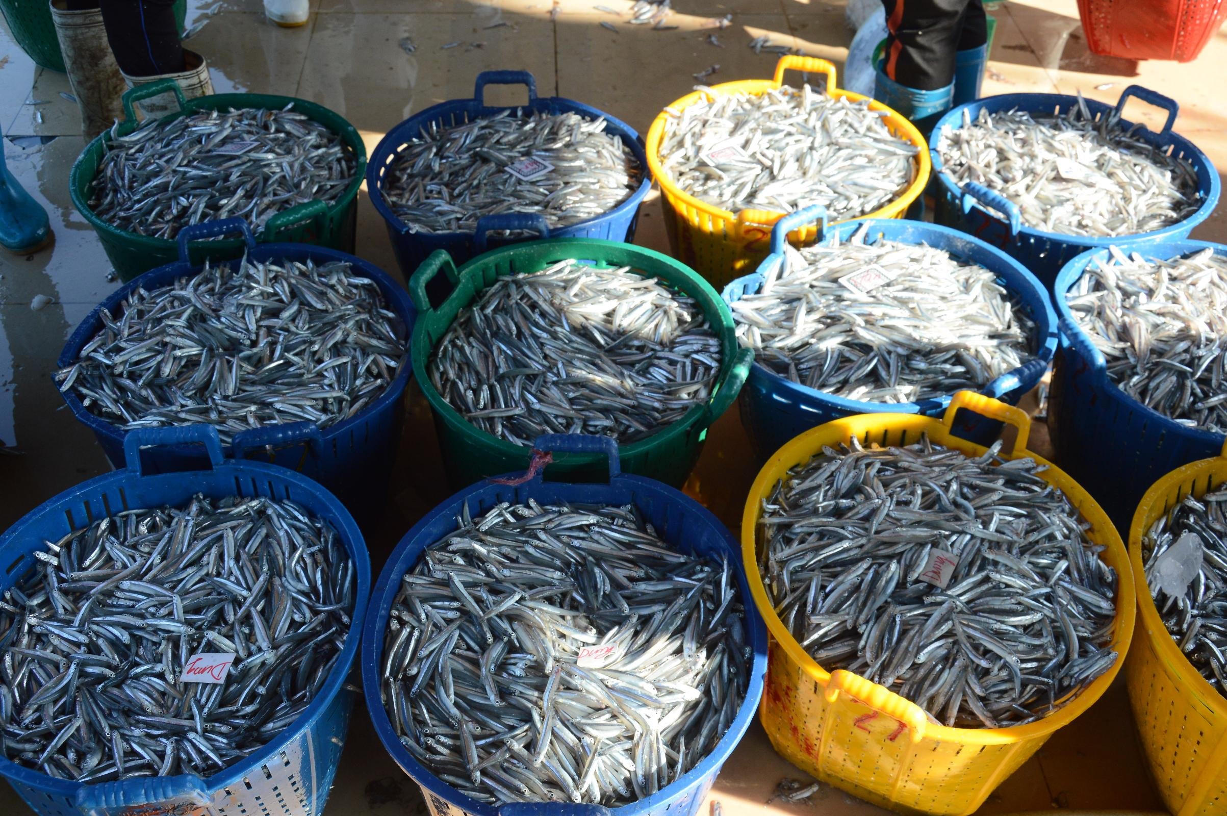 Sau khi thu mua, những sọt cá cơm tươi rói được tiểu thương vận chuyển ra chợ bán trong dịp Tết Nguyên đán.