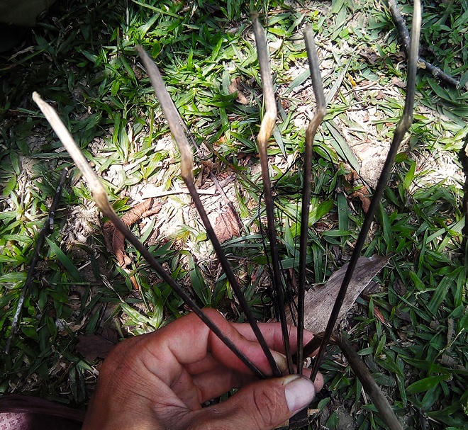 Lâm bật mí: “Đây là bẫy đạp chế theo chân gà, nếu gà đi qua lối tra bẫy mà đạp nhằm chân gà bằng tre này thì sẽ bị cột chân lại, thường loại bẫy này rất tốn công có khi tra bẫy cả tháng chẳng thấy con gì cả, nhưng khi đã mắc là được vài ba con luôn.