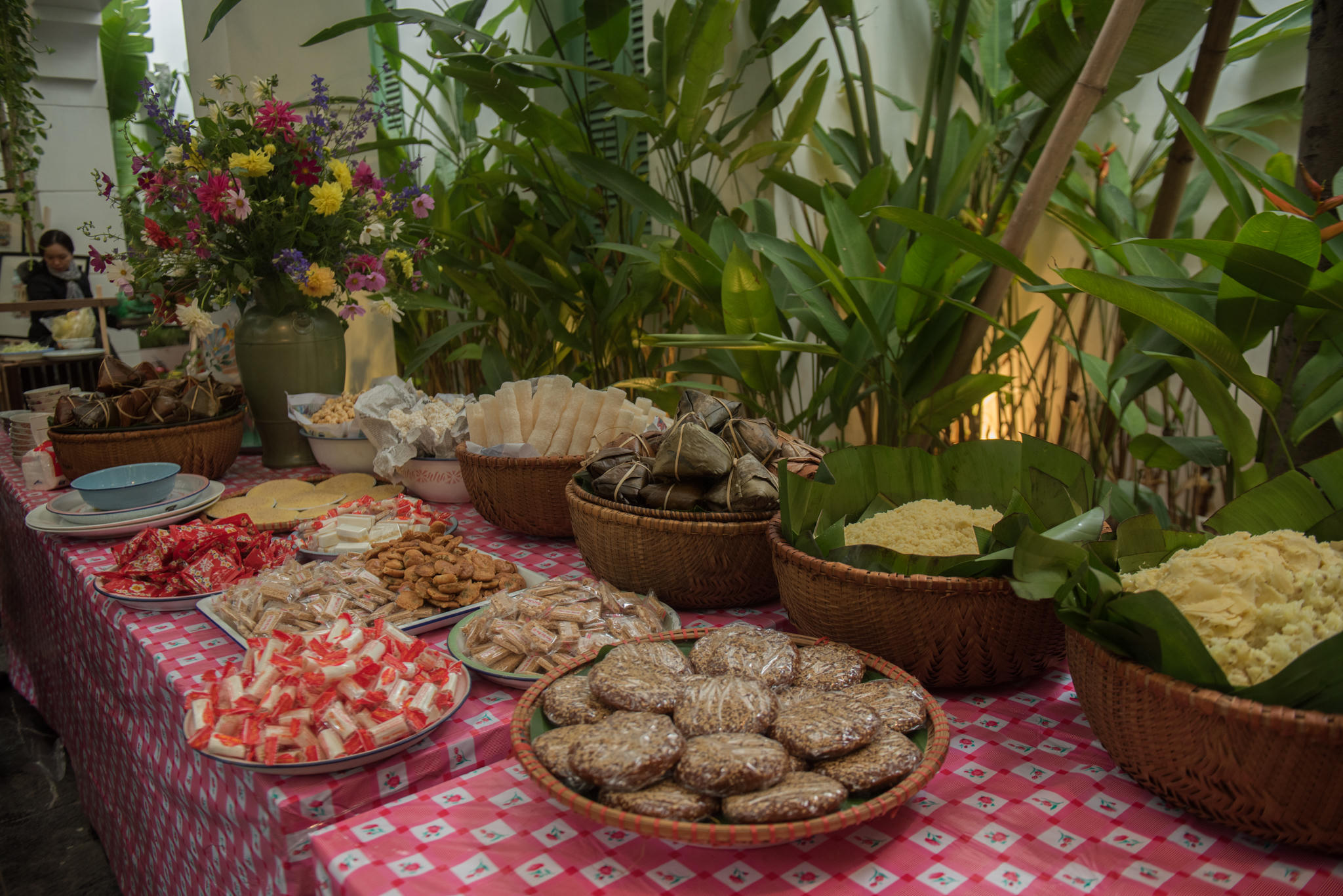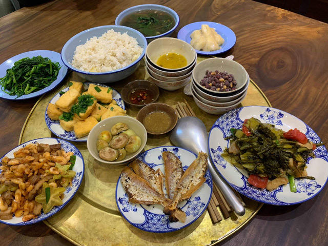 Đặc biệt, không chỉ thưởng lãm tranh, công chúng còn được thưởng thức những “tác phẩm ẩm thực” món ăn thời bao cấp tinh tế và hấp dẫn. Vẫn những món ăn tưởng như quen thuộc với thế hệ "ông bà ta" như lạc rang muối, canh cua rau sam tập tàng, cà pháo, rau muống luộc chấm tương bần, dưa chua xào tóp mỡ, cá khô, đậu phụ rán nhúng hành, cơm độn sắn độn bo bo... nhưng mang tới một trải nghiệm cực kỳ mới mẻ. Vừa ngon khó cưỡng, vừa đẹp đẽ cầu kỳ trong cách chế biến, tinh tế trong việc lựa chọn nguyên liệu, tài tình trong cách bày biện, để mang tới một mâm cơm đẹp cả về hình ảnh, mùi vị và cảm xúc.
