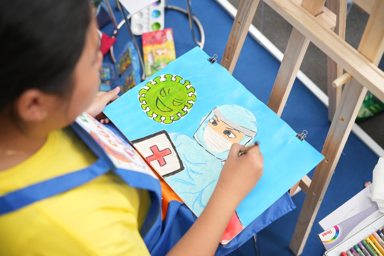 Thiên Ân vẽ tranh tại buổi lễ phát động cuộc thi “Em vẽ dũng sĩ tiêm ngừa cùng VNVC”. Ảnh: Mộc Thảo |