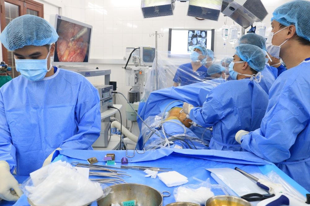 Các y bác sĩ Bệnh viện Hữu nghị Việt Tiệp cùng sự hỗ trợ của các chuyên gia đến từ Trung tâm Ghép tạng, Bệnh viện Hữu nghị Việt Đức thực hiện phẫu thuật nội soi lấy thận của người hiến. |