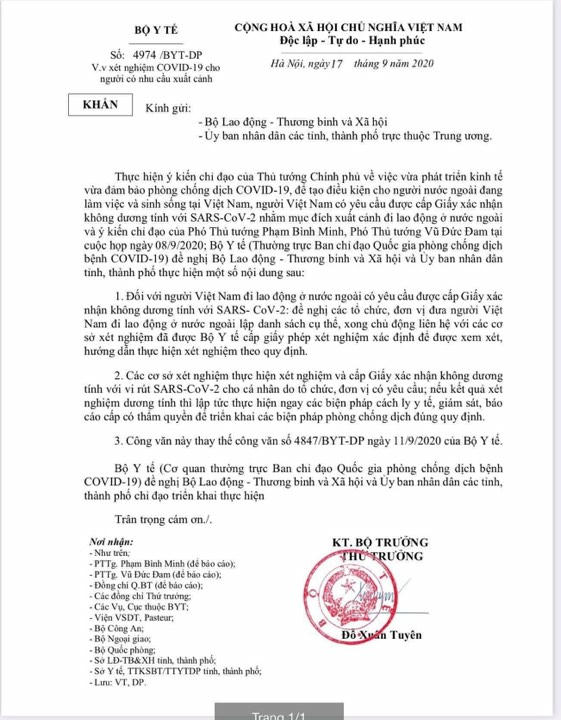 Trong công văn, Bộ Y tế cho biết: Thực hiện ý kiến chỉ đạo của Thủ tướng Chính phủ về việc vừa phát triển kinh tế vừa đảm bảo phòng chống dịch COVID-19, để tạo điều kiện cho người nước ngoài đang làm việc và sinh sống tại Việt Nam, người Việt Nam có yêu cầu được cấp Giấy xác nhận không dương tính với SARS-COV-2 nhằm mục đích xuất cảnh đi lao động, học tập ở nước ngoài. Bộ Y tế đề nghị Bộ Lao động Thương binh xã hội và Ủy ban nhân dân các tỉnh, thành phố thực hiện một số nội dung cụ thể dưới đây.