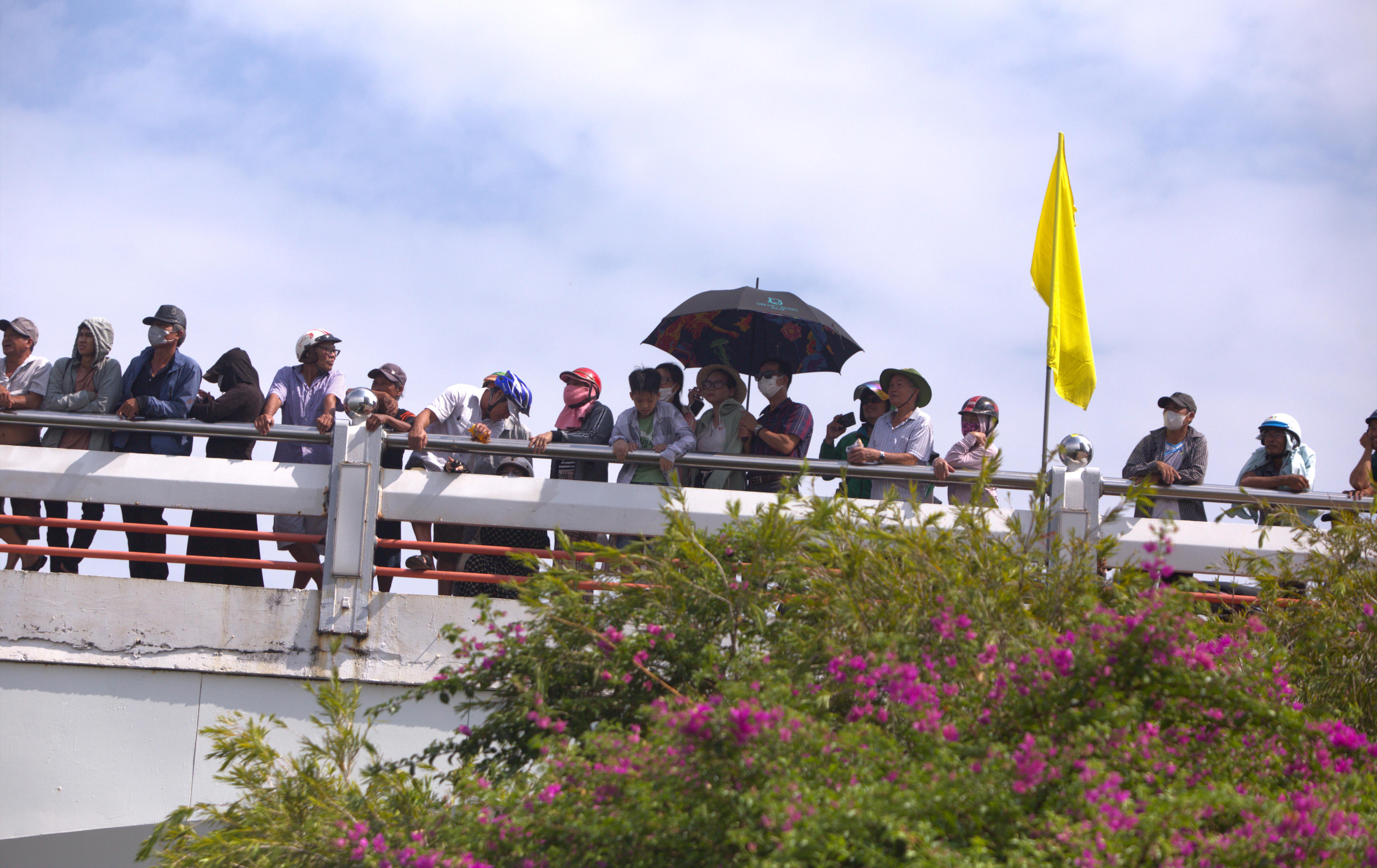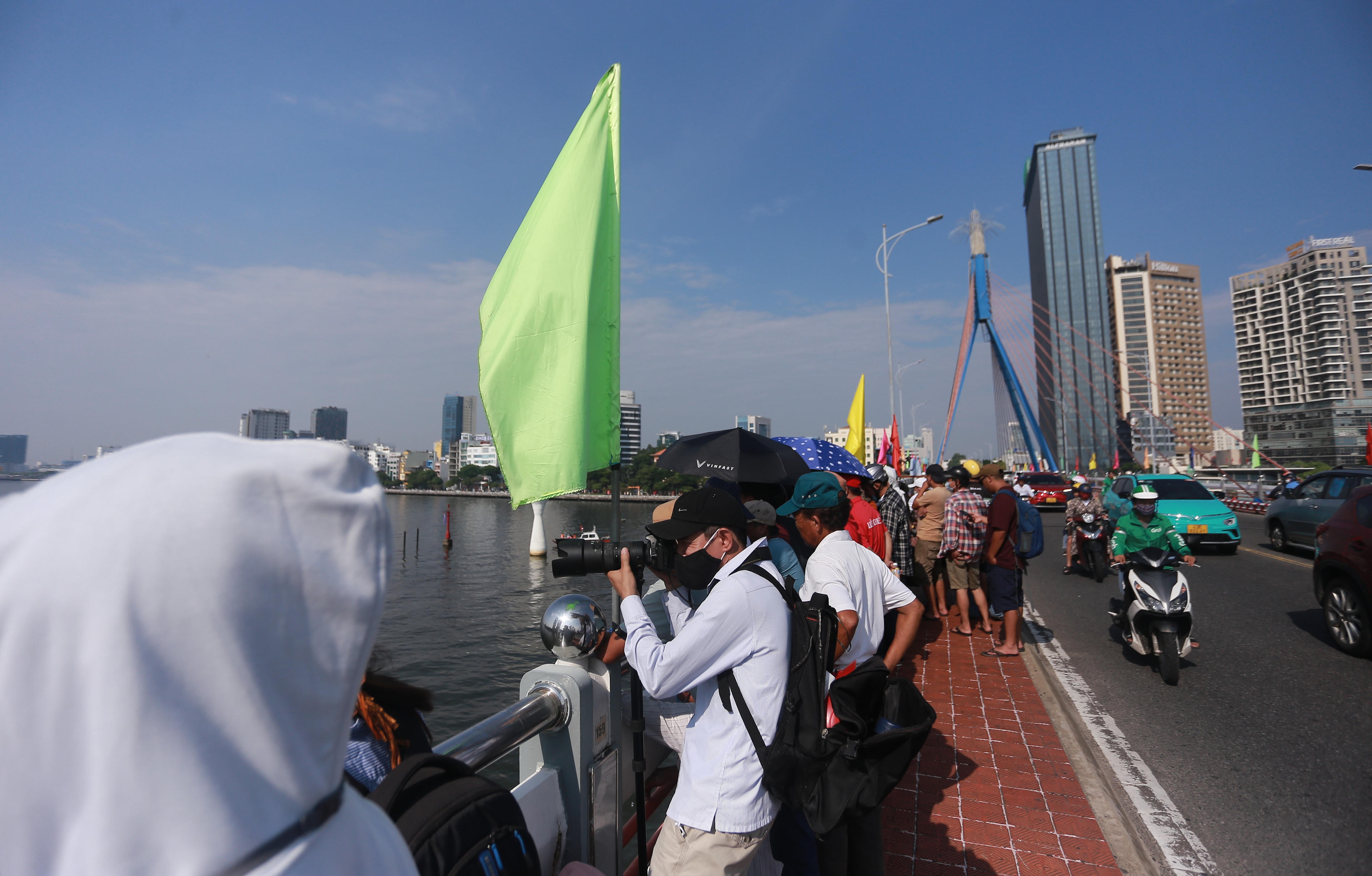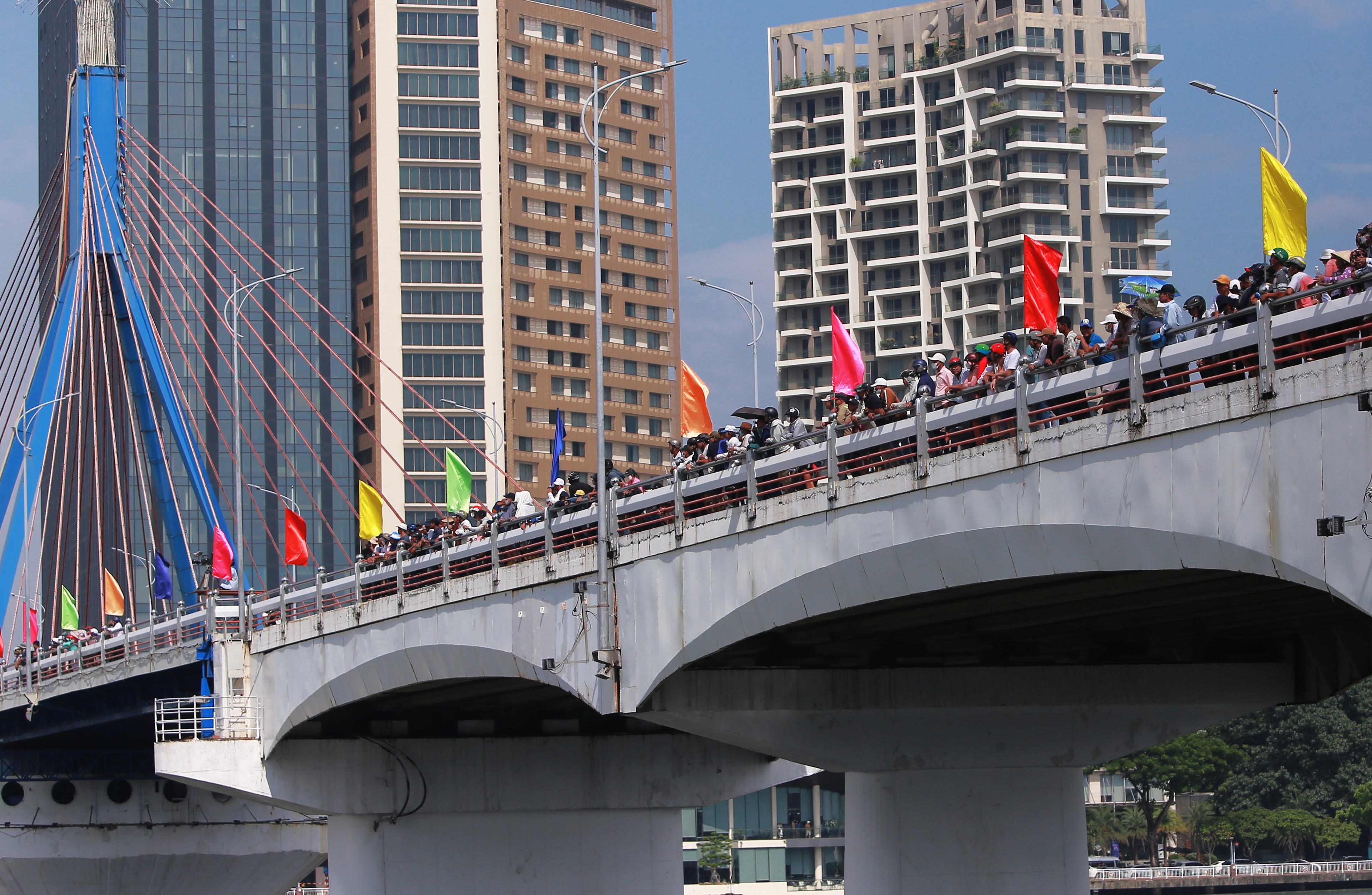 Người dân và du khách đội nắng, chen chân tại cầu sông Hàn và cầu Rồng để theo dõi đua thuyền.