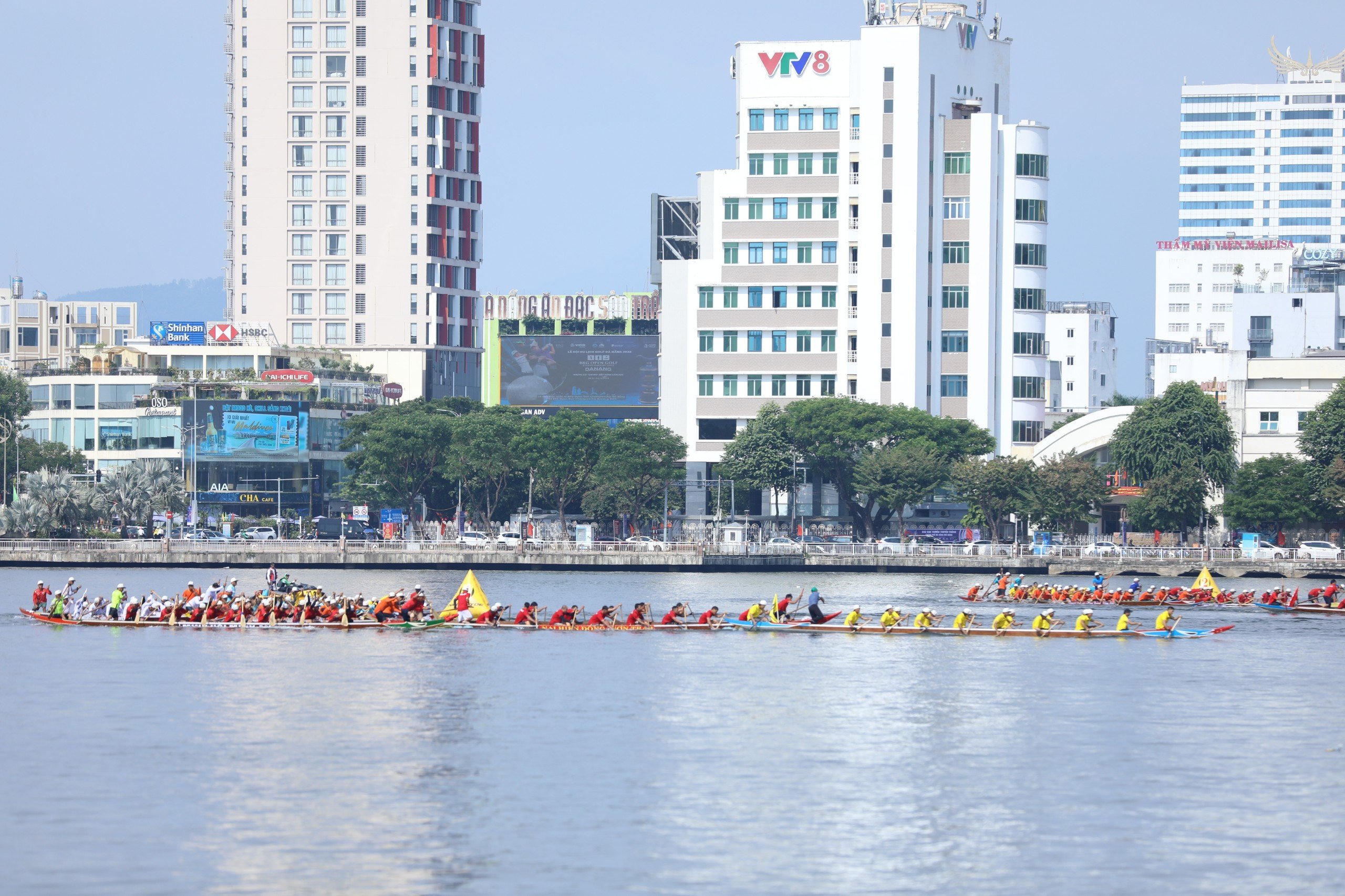 Dưới sông Hàn, các đội đua bám đuôi nhau từng cm.