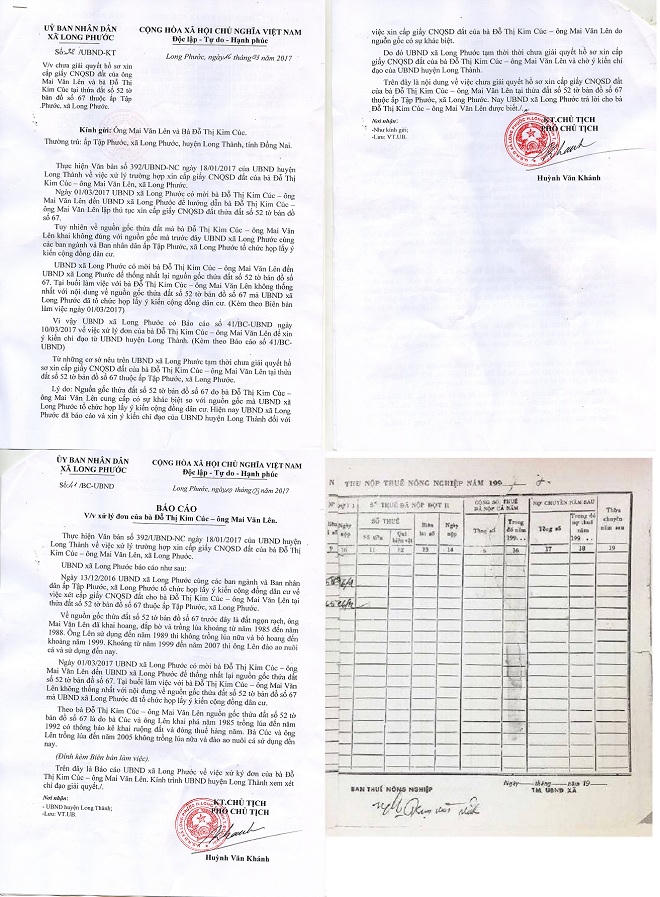 Sau đó, UBND xã đã lấy ý kiến cộng đồng dân cư về diện tích đất trên của gia đình bà Cúc đang sử dụng. Ngày 21/11/2016, UBND xã Long Phước tiếp tục mời hộ gia đình bà Cúc lên trụ sở để làm việc về vấn đề xác định lại nguồn gốc đất, quá trình sử dụng đất.