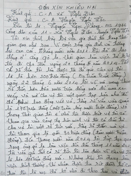 Theo anh Phong thì số tiền tiết kiệm trong lúc đi làm thuê ở nước ngoài gửi về cho vợ nhưng vợ lại anh không tiết kiệm, chăm lo con cái mà lại tiêu xài cá nhân, cho một người đàn ông khác vay mượn, rồi vay tiền và vàng của nhiều anh em họ hàng khác để tiêu xài.