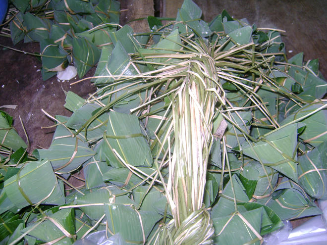 Khó khăn cuối cùng là túm các gốc của lá tre thành hình tam giác và buộc dây để mỗi mặt của chiếc bánh bằng nhau.