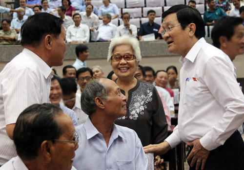 Chủ tịch nước cũng đề nghị người dân mạnh dạn góp ý xây dựng Đảng. "63 tỉnh thành, người nào vi phạm tiêu chí, bà con cứ gửi thư về Ủy ban nhân sự Trung ương, Bộ Chính trị khóa XI. Lời nói gió bay nên mong cử tri hãy gửi thư. Kể cả chúng tôi, sẽ có đồng chí khác xem xét, không loại trừ ai cả", Chủ tịch nước khẳng định và cho rằng với sự góp ý của nhân dân hy vọng sau đại hội sẽ có một ban chấp hành xứng đáng để "người dân hài lòng khi nghe tivi đọc tên nhân sự khóa mới".