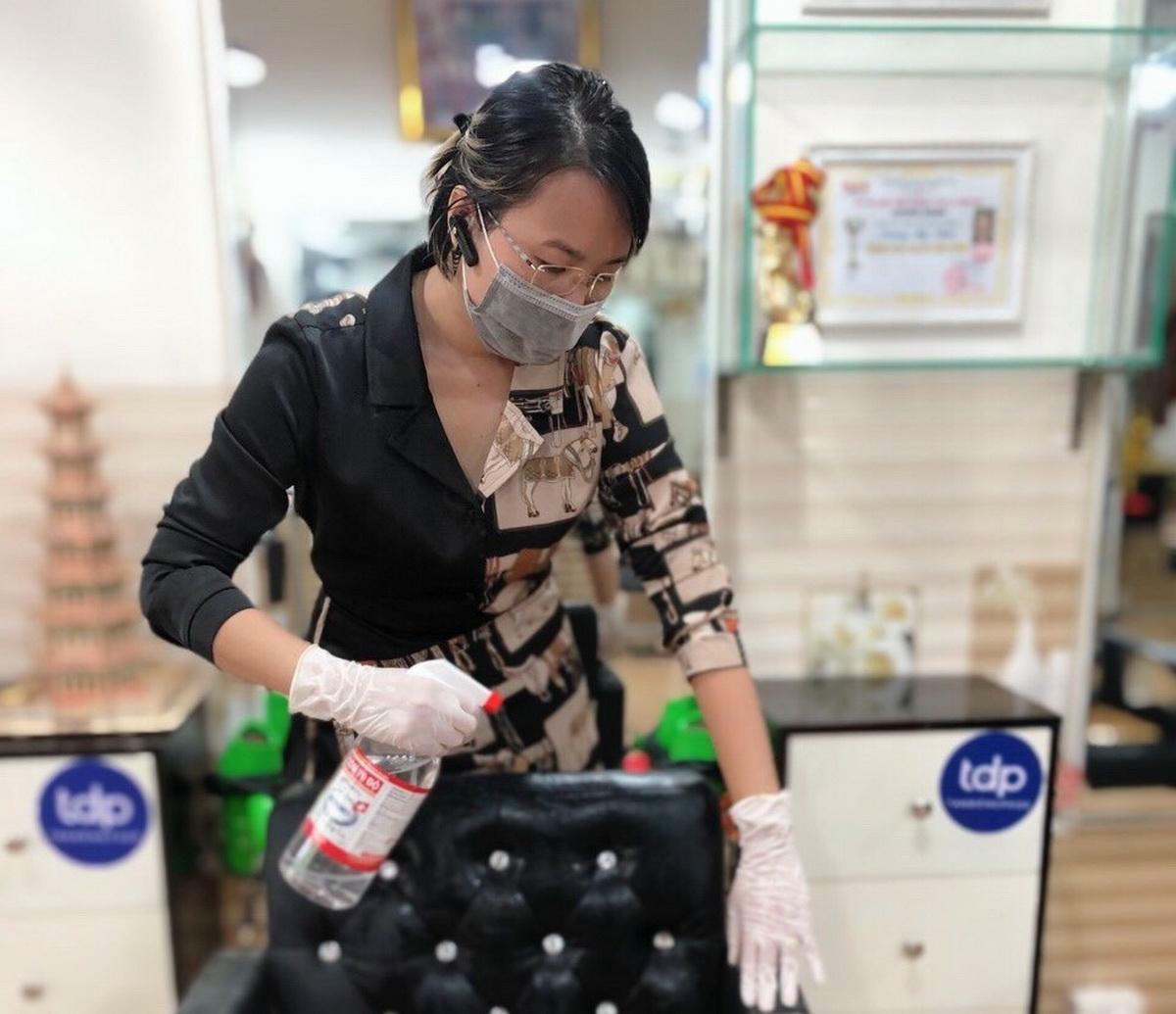 Chị Nhân cho biết: “Để chuẩn bị mở cửa hoạt động trở lại, tiệm cũng đã lên kế hoạch trang bị đầy đủ các bước, nhất là khẩu trang, nước rửa tay sát khuẩn. Do tình hình dịch bệnh còn diễn biến phức tạp, nên mình cũng tự ý thức tuân thủ nghiêm các biện pháp phòng dịch, trang bị cho nhân viên thêm kính bảo hộ chống giọt bắn, có sổ tay ghi chép thông tin những khách đến làm tóc và tuân thủ việc test nhanh định kỳ theo quy định”.