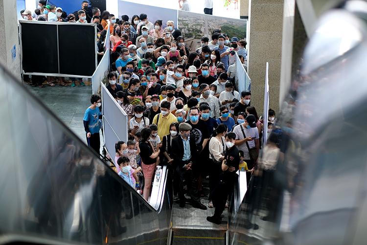 Nhân viên nhà ga liên tục yêu cầu người dân giữ khoảng cách nhưng không xuể do lượng người quá đông.