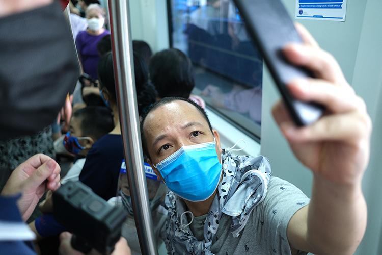 Trong toa xe, lượng người đứng chen chân sát vào nhau.