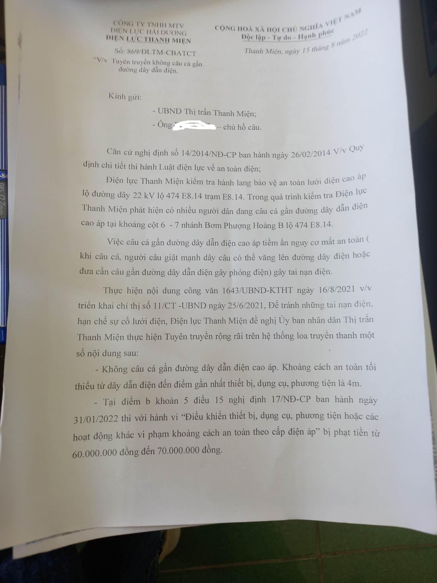 Tiếp theo, ngày 15/8 điện lực huyện Thanh Miện đã gửi công văn đến UBND thị trấn Thanh Miện và ông L.V.T. chủ hồ câu để tuyên truyền về việc không câu cá gần đường dây dẫn điện. Trong công văn điện lực huyện Thanh Miện khuyến cáo: Việc câu cá gần đường dây dẫn điện cao áp tiềm ẩn nguy cơ mất an toàn (khi câu cá người câu giật mạnh dây câu có thể văng lên đường dây điện hoặc đưa cần câu gần đường dây dẫn điện gây phóng điện) gây tai nạn điện.