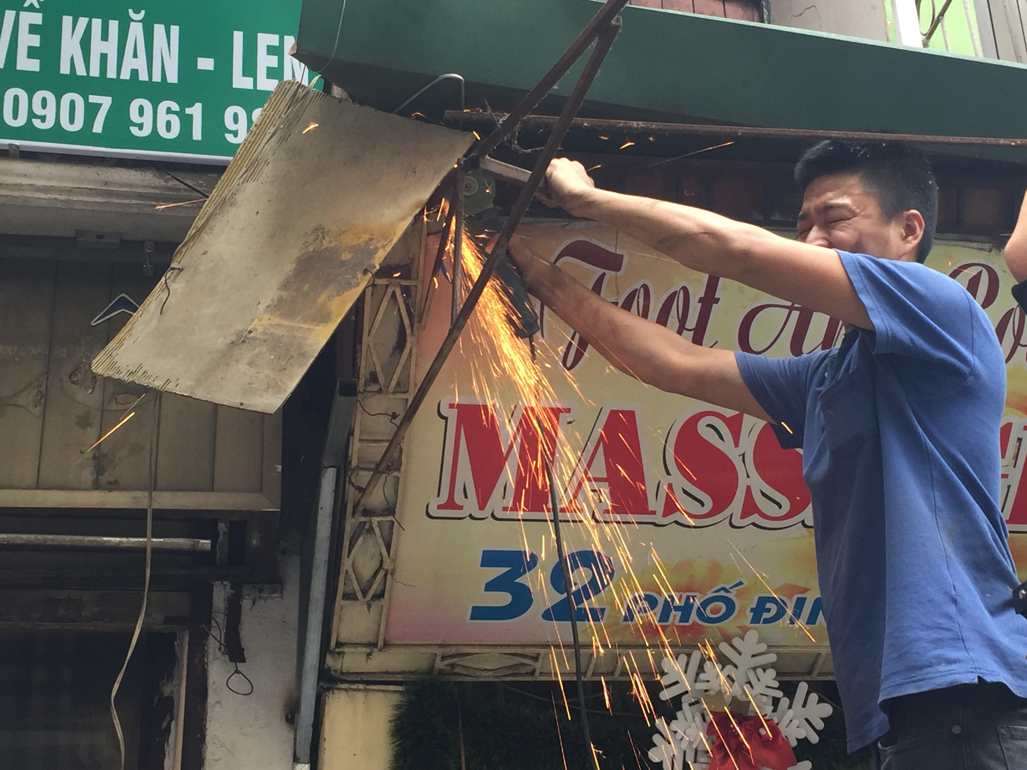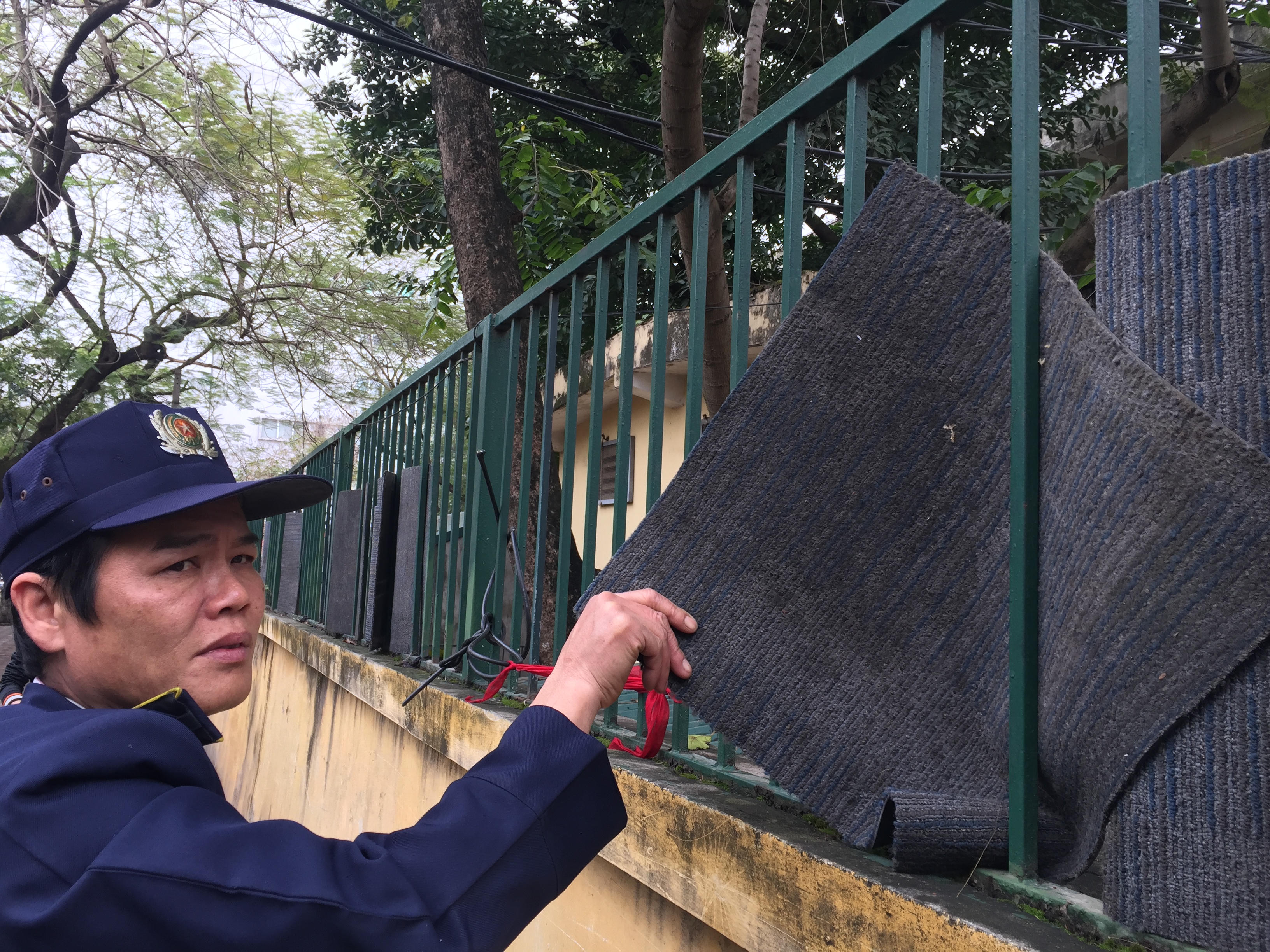 | Lực lượng chức năng tháo dỡ những tấm chắn trên cổng một cơ quan nhà nước tại vỉa hè đường Hoàng Hoa Thám (Tây Hồ, Hà Nội) |