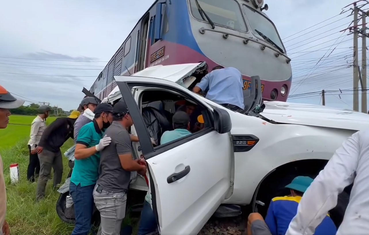 Người dân cứu tài xế bán tải bị mắc kẹt sau khi va chạm với tàu hoả