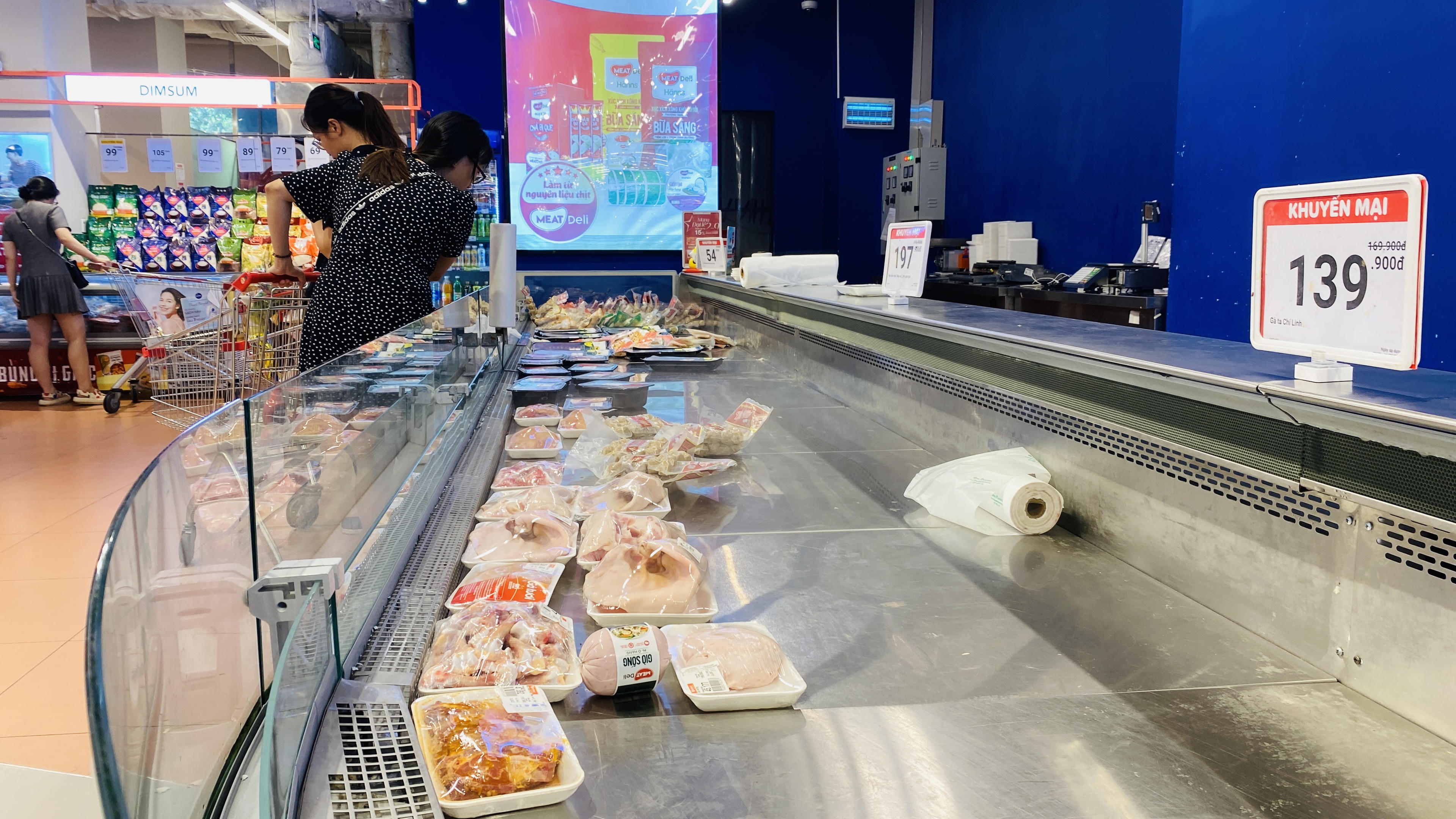 Quầy thịt tươi cũng chỉ còn 1-2 khay thịt. |