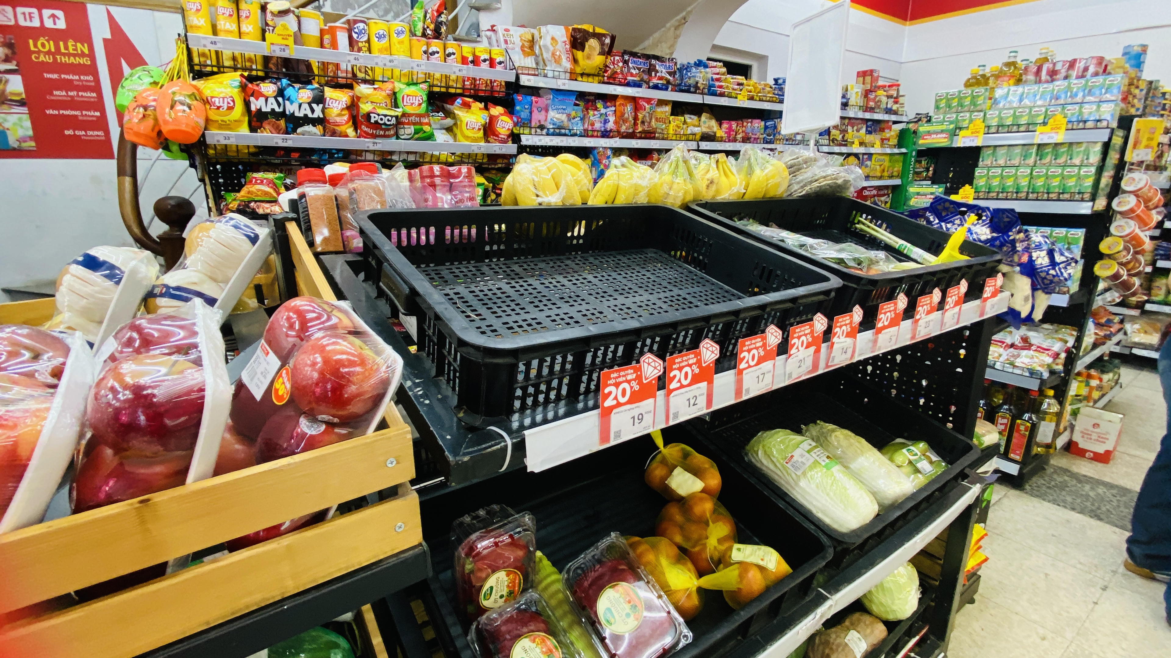 Cửa hàng Winmart + trên phố Dịch Vọng cũng hết sạch rau củ. |