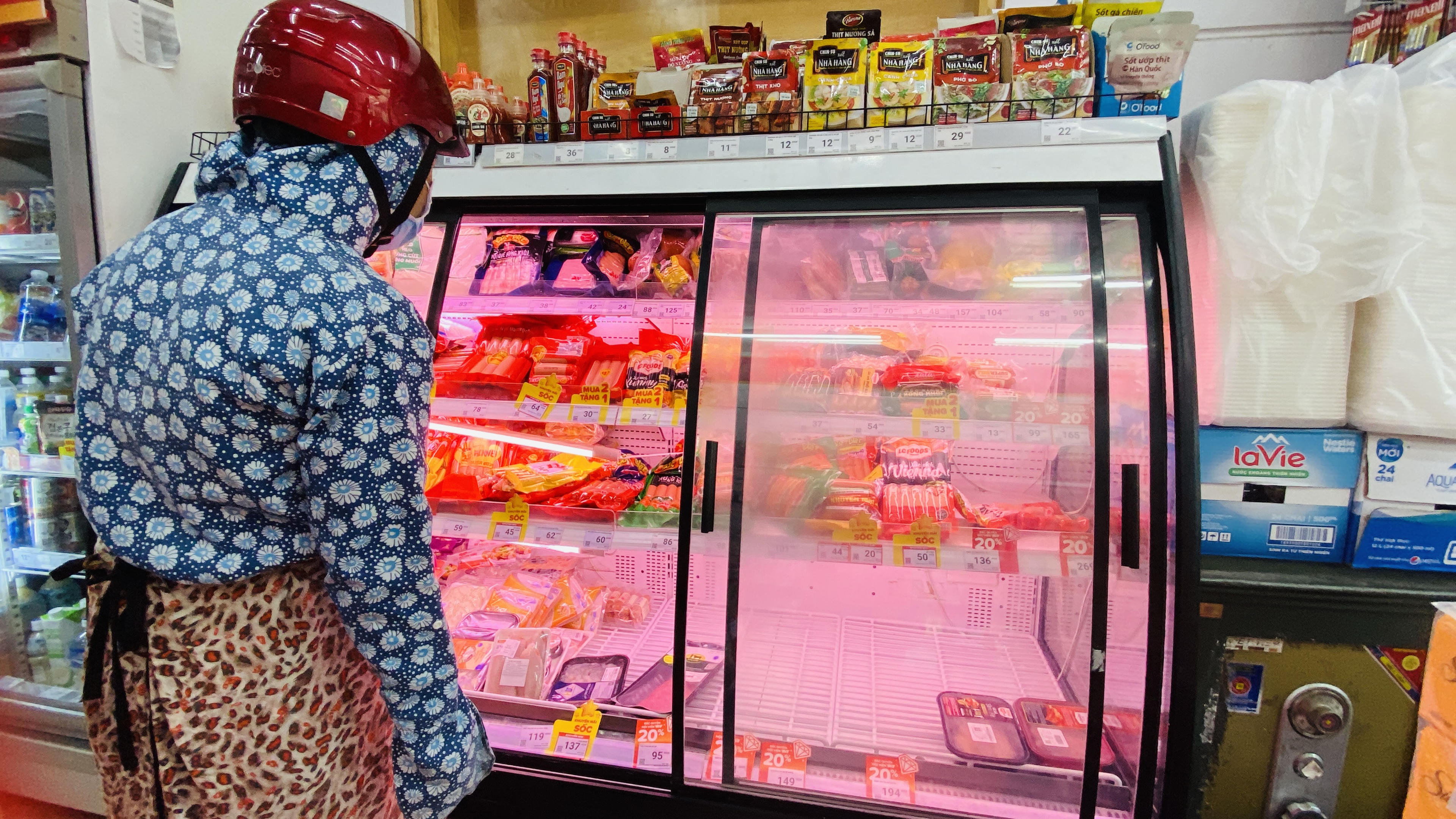 Chị Phương đang lựa chọn một số khay rau củ cắt sẵn vì đã hết sạch các loại rau. |