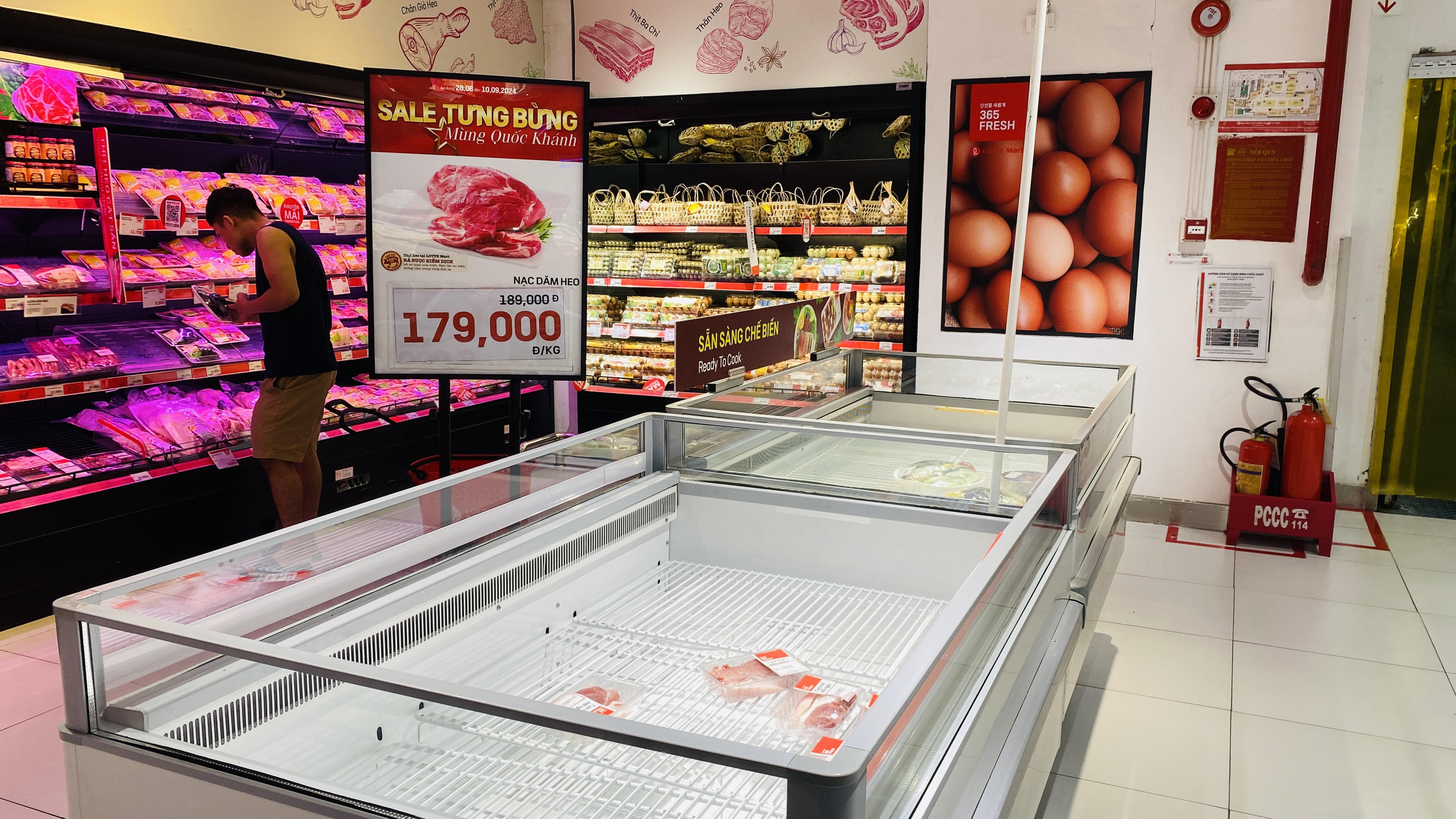 Cụ thể, tại Winmart Thăng Long, các loại rau củ gần như đã hết sạch, dù trước đó đã được bổ sung rau mới. Quầy thịt tươi của siêu thị cũng chỉ còn lác đác một số loại. Điều này trái với ngày thường.
