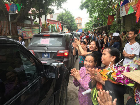 | Người dân xã Đồng Tâm phấn khởi chào đón Chủ tịch TP Hà Nội Nguyễn Đức Chung (Ảnh chụp lúc 10h20/ vov.vn) |