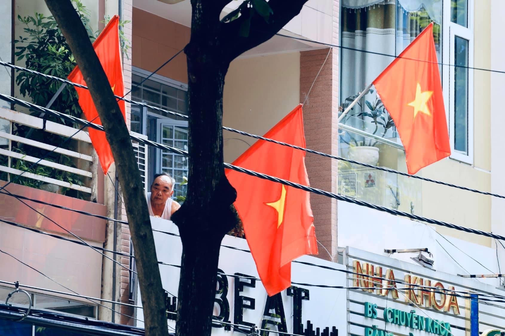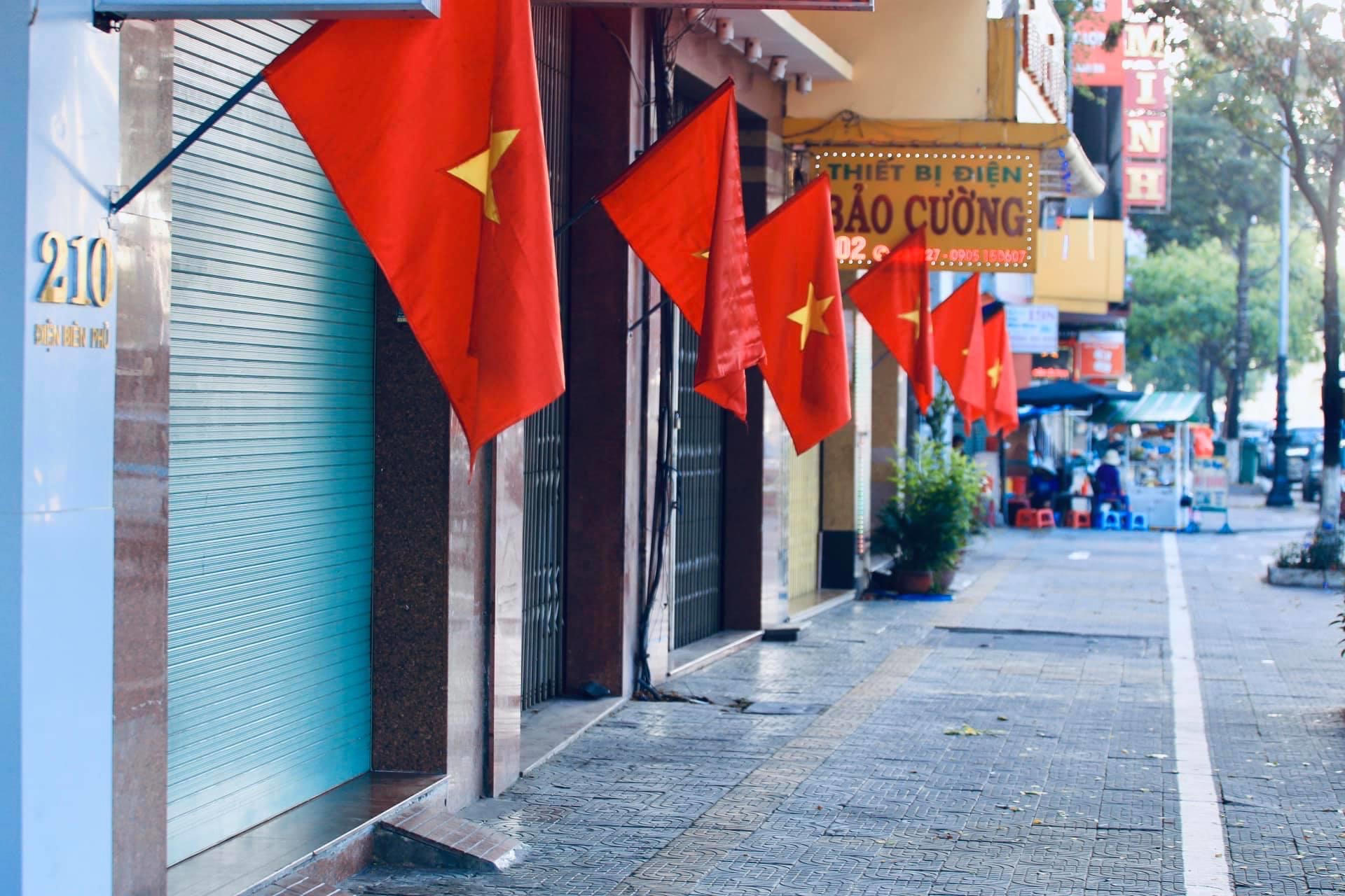 Từ chiều 29/4, các tuyến phố ở Đà Nẵng như thay áo mới với việc treo cờ đồng loạt của người dân. Thời điểm này, dịch bệnh Covid -19 được kiểm soát bước đầu, việc giãn cách xã hội cũng được nới lỏng nên người dân hồ hởi ra đường, chúc mừng nhau.