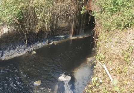 Điều khiến PV tò mò là ở con mương này, phía sau bờ rào của Công ty TNHH Nhuộm và Giặt thời trang quốc tế là một ống nhựa đường kính trên 10cm đang xả thải với khối lượng nước rất lớn. Anh Q lấy chai nhựa múc lên cho PV xem thì nước có màu đen và bốc lên mùi như thuốc tẩy quần áo và hóa chất rất khó chịu. Trên mặt nước, từng mảng bọt đen trắng lẫn vào nhau nổi bồng bềnh hoặc bám vào cành cây.