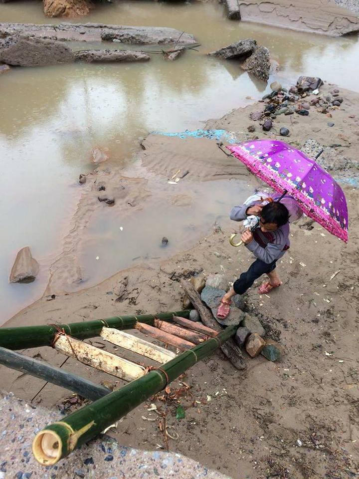 | Để lên được bờ bên kia, người dân phải dựng tạm một chiếc thang tre rồi trèo lên (ảnh từ Facebook Căn Hai Là Xíu) |
