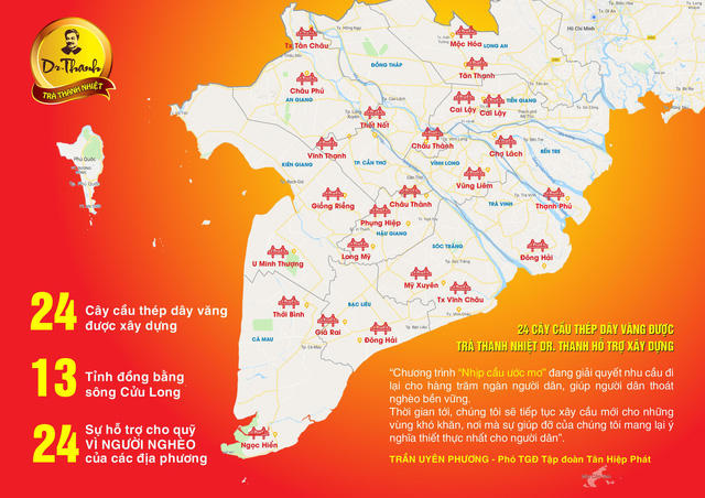 Hiện nay Tân Hiệp Phát và nhãn hàng Trà Thanh nhiệt Dr Thanh đang hoàn thiện những khâu cuối cùng để khánh thành, đưa vào sử dụng 4 cây cầu liên tiếp tại Bến Tre, Sóc Trăng, Long An, và Cà Mau để phục vụ bà con trong dịp Tết Nguyên đán. Cũng trong thời gian này, chúng tôi tiếp tục khởi công xây dựng liên tiếp 4 cây cầu tại các tỉnh Kiên Giang, Bạc Liêu, Cần Thơ, An Giang và sẽ đưa vào sử dụng ngay sau Tết. Đây là món quà Tết mà chúng tôi trao tặng để cám ơn bà con người dân tại các địa phương này.