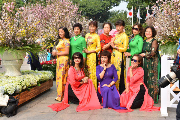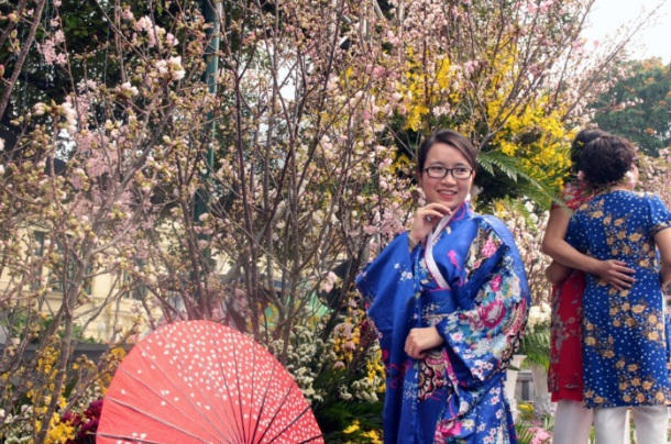 | Một hình ảnh giao lưu văn hóa rất đẹp giữa tà áo dài truyền thống và những cánh hoa đặc trưng của Nhật Bản. Ảnh Hồng Anh |