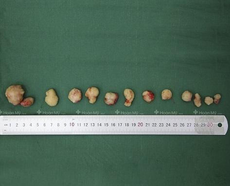 Sau 40 phút thực hiện, ca phẫu thuật thành công, hơn 13 khối u lớn nhỏ với nhiều kích thước khác nhau (1 - 3cm) được lấy ra từ đầu, vai, bụng. Sau đó mang đi thực hiện giải phẫu bệnh, kết luận u nang biểu bì.