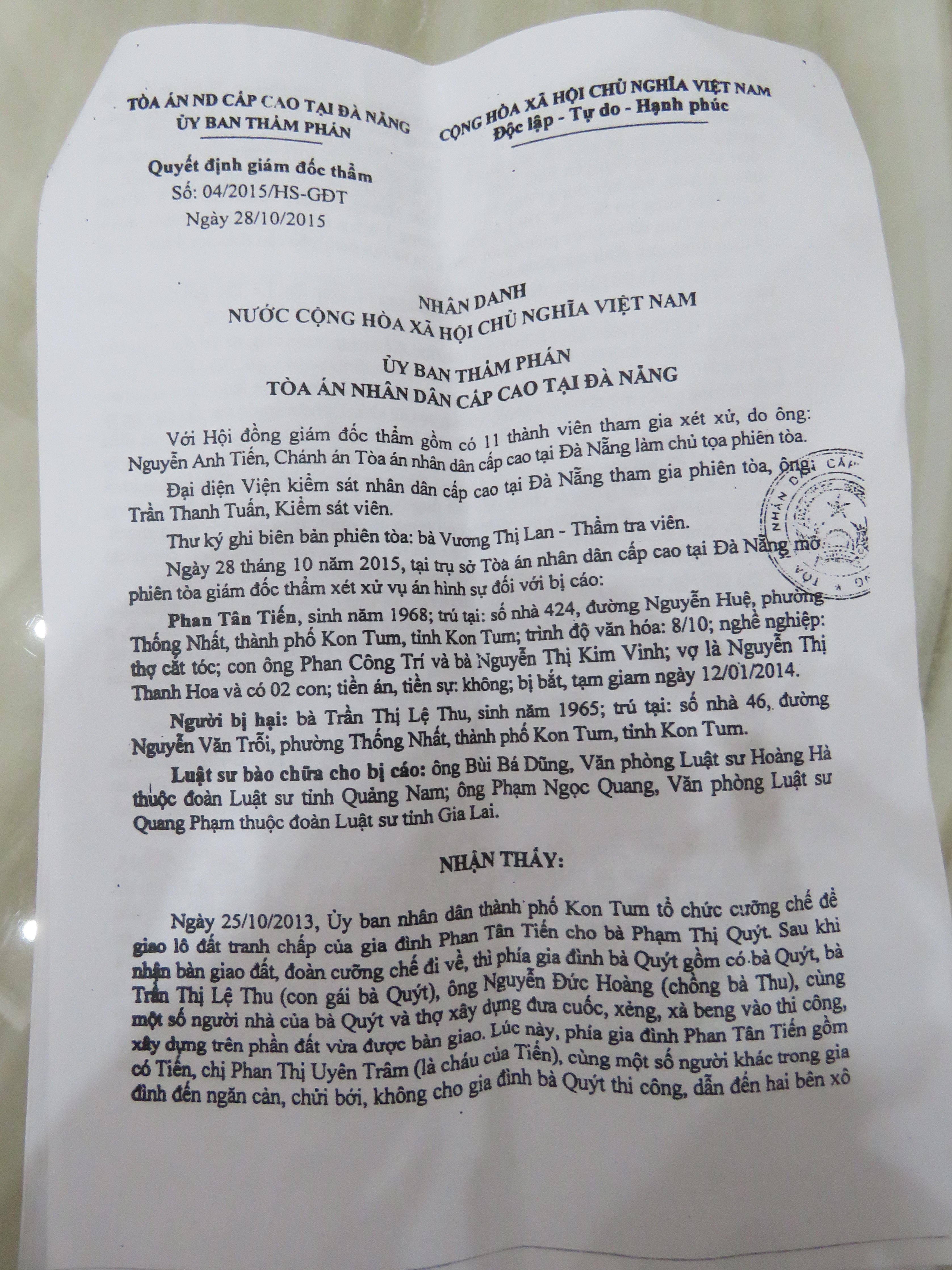 Mong muốn làm rõ sự việc, trả lại sự công bằng, trong sạch cho bản thân, ông Tiến đã có nhiều đơn thư gửi đến các cơ quan chức năng. Ngày 28/10/2015, TAND Cấp cao Tại Đà Nẵng đã có Quyết định giám đốc thẩm số 04/2015.