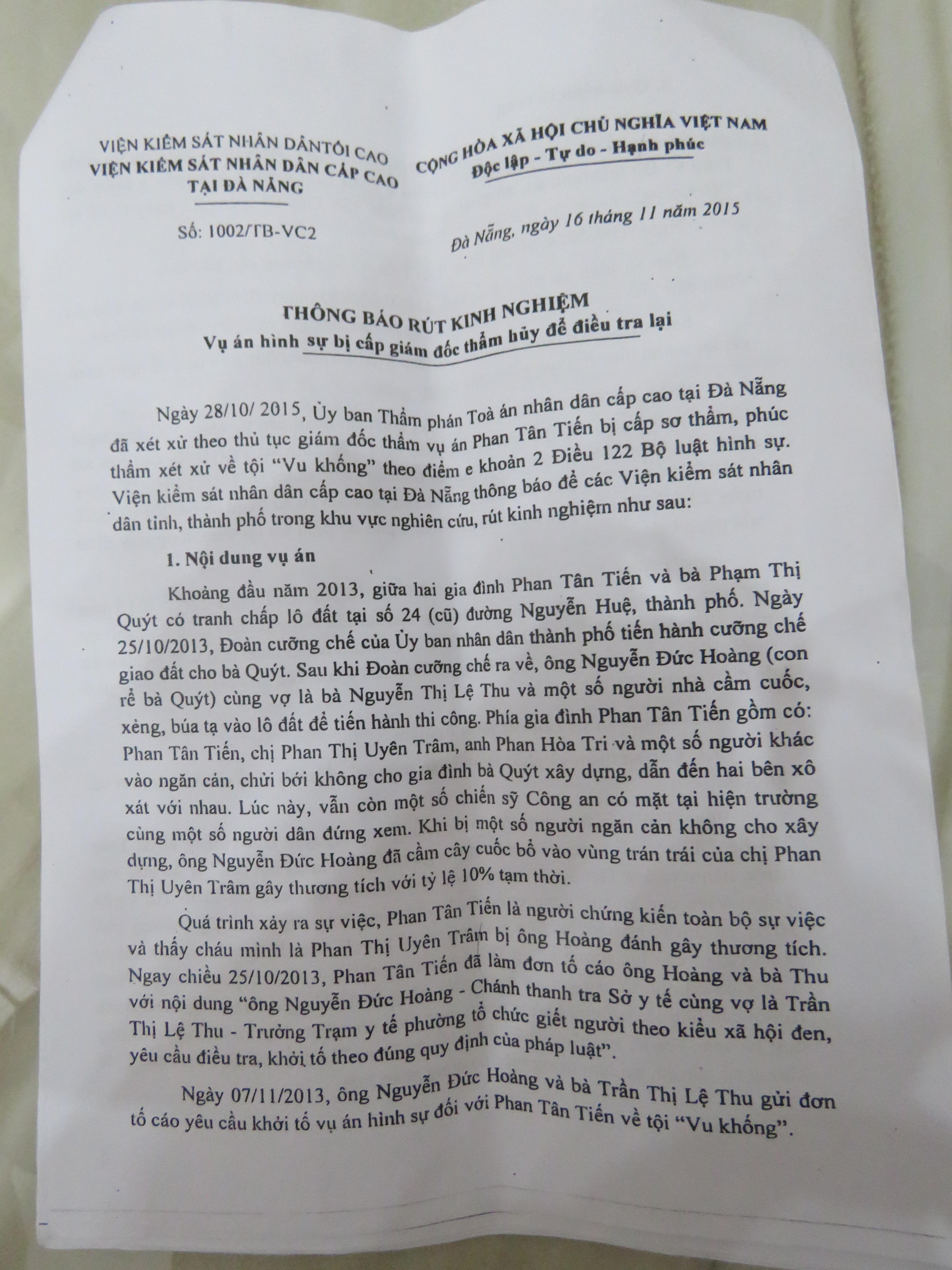Ngày 16/11/2015, Viện KSND Cấp cao tại Đà Nẵng cũng đã có thông báo rút kinh nghiệm về vụ án hình sự nói trên. Trong đó khẳng định: “Cấp sơ thẩm và phúc thẩm nhận thức sai về hành vi tố cáo và hành vi vu khống; nhận thức sai về tội “Cố ý gây thương tích” và hành vi gây thương tích do trạng thái tinh thần bị kích động mạnh”...